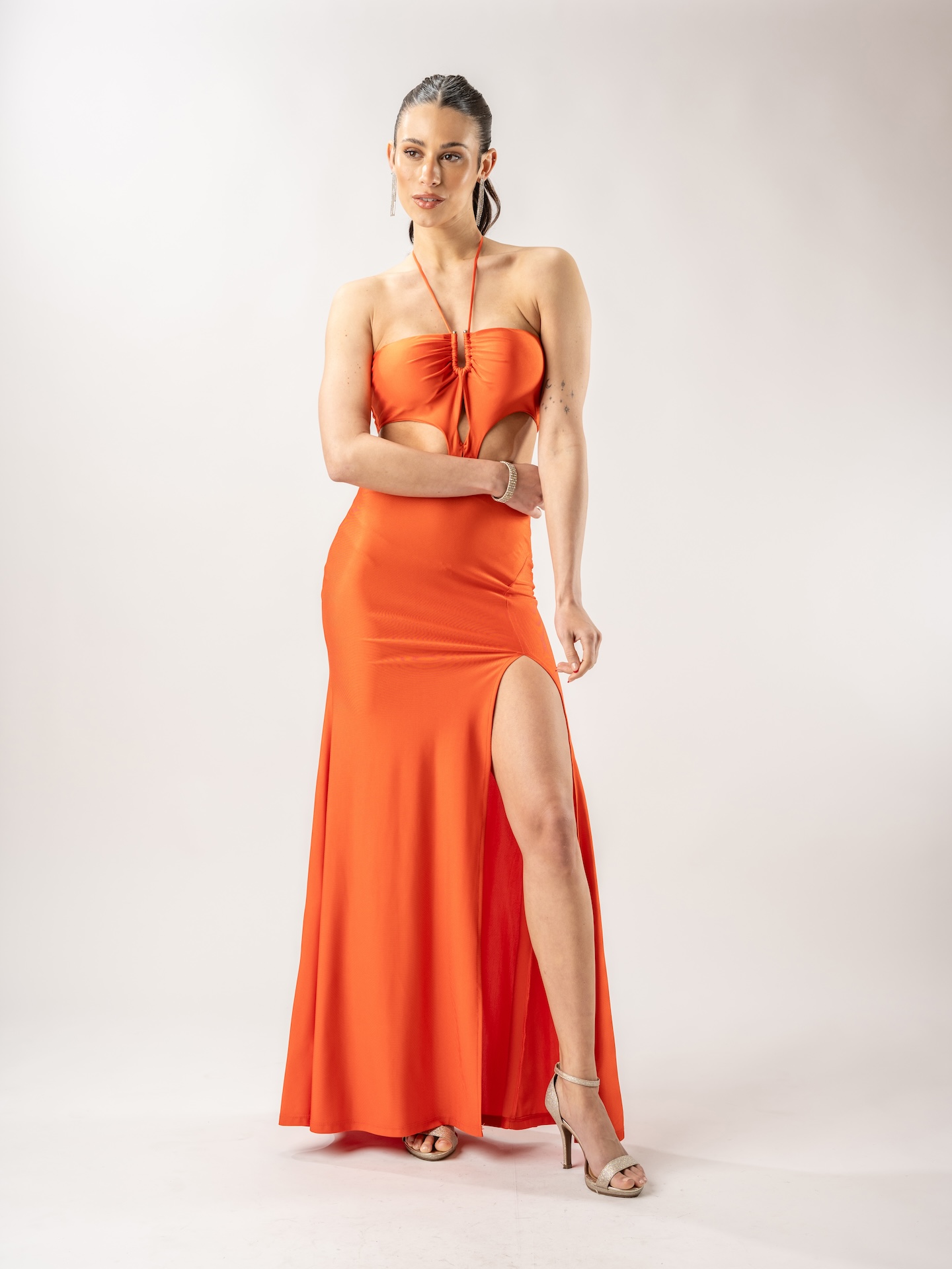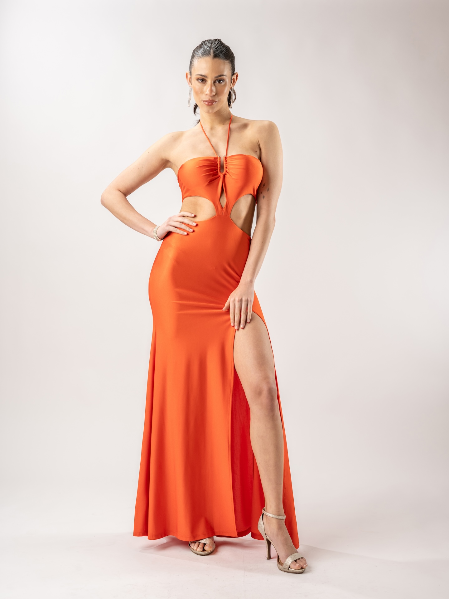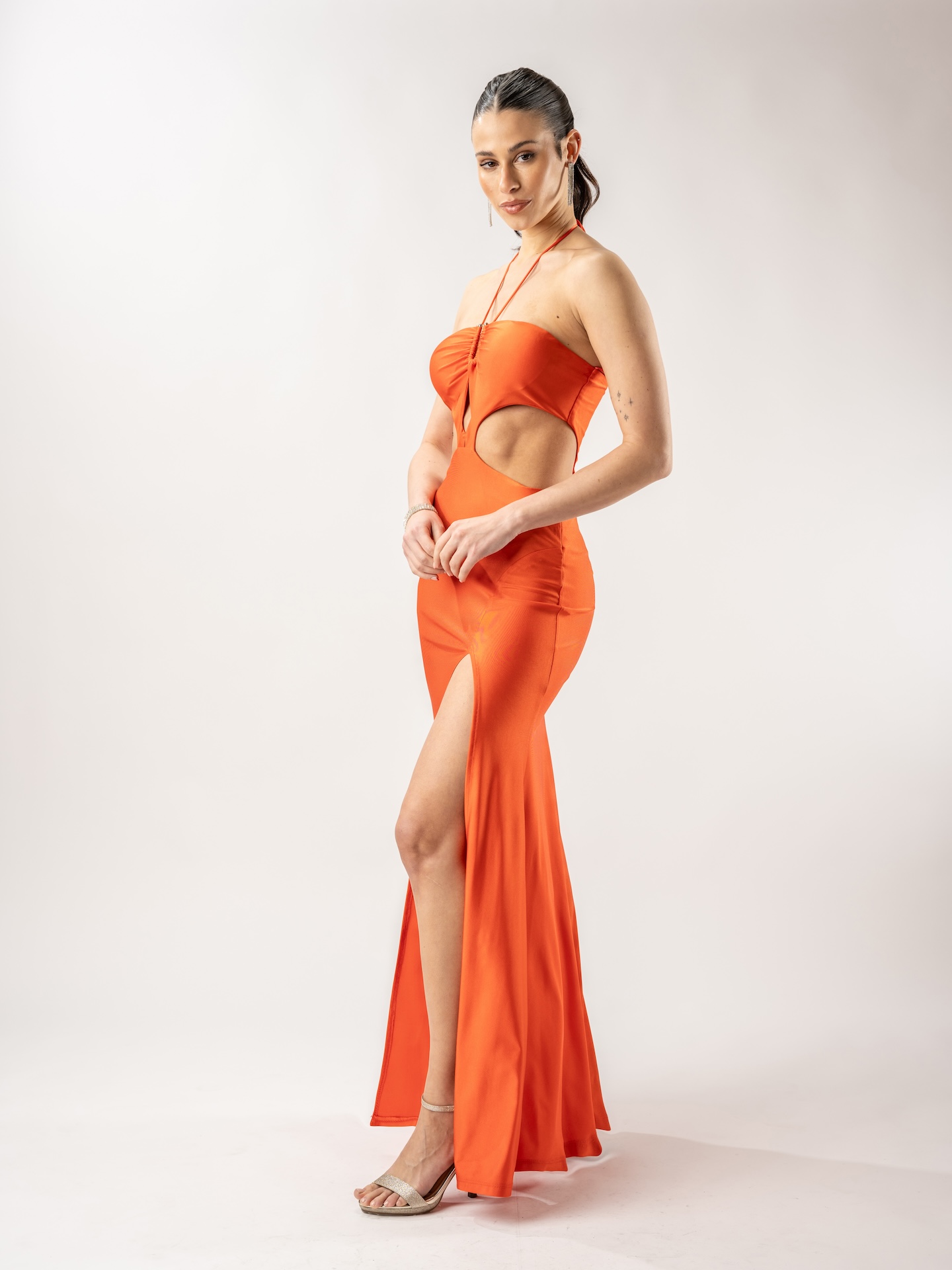 Vestido largo anatomico de Saten de Lycra con tajo delantero, con sustracciones centrales en delantero y espalda super sexies, pasador metalico en forma de U en escote, gerando frunces en la parte del busto, acompañado con tazas, espalda recta y tiras delanteras para atar en cuello.