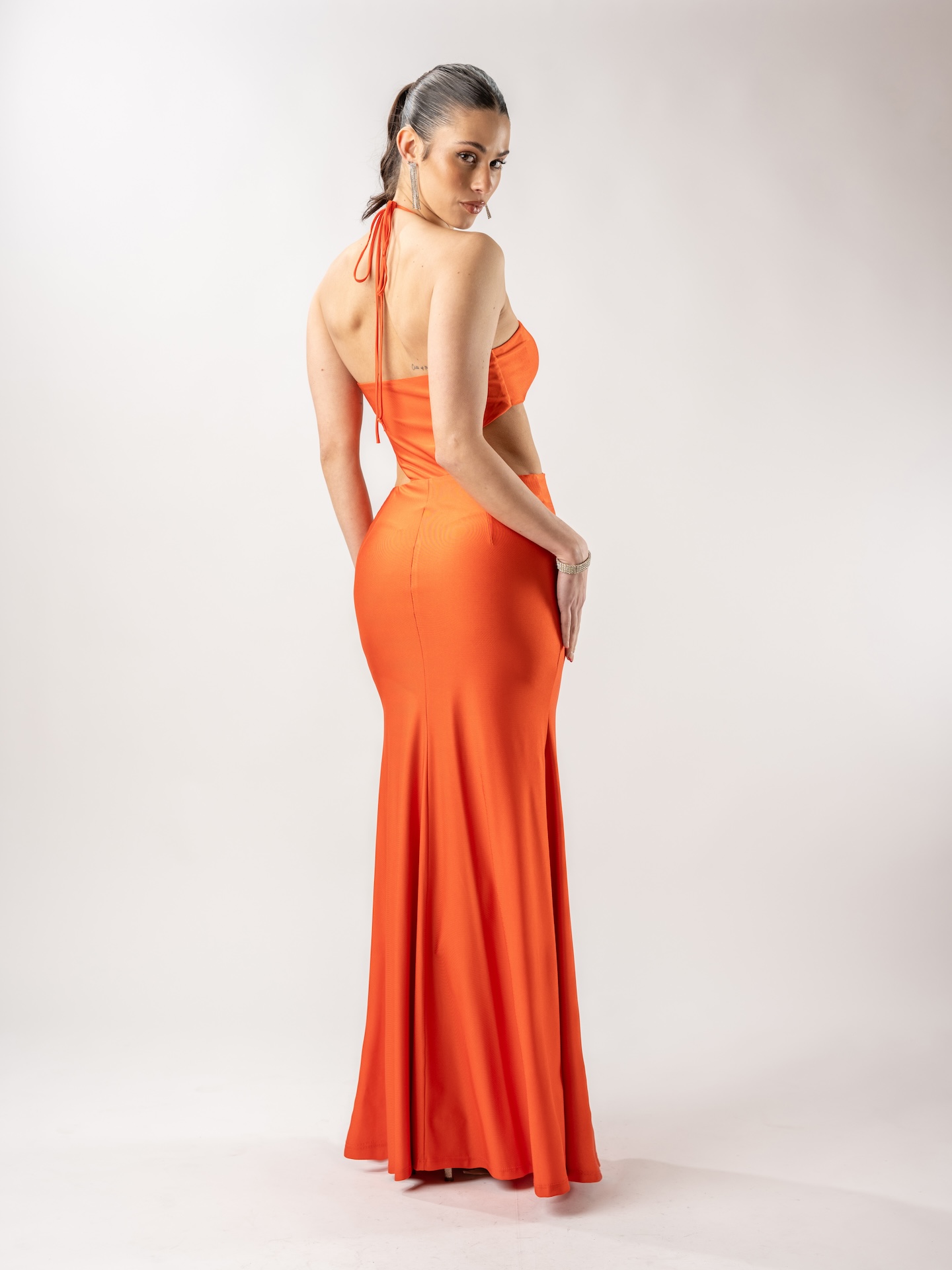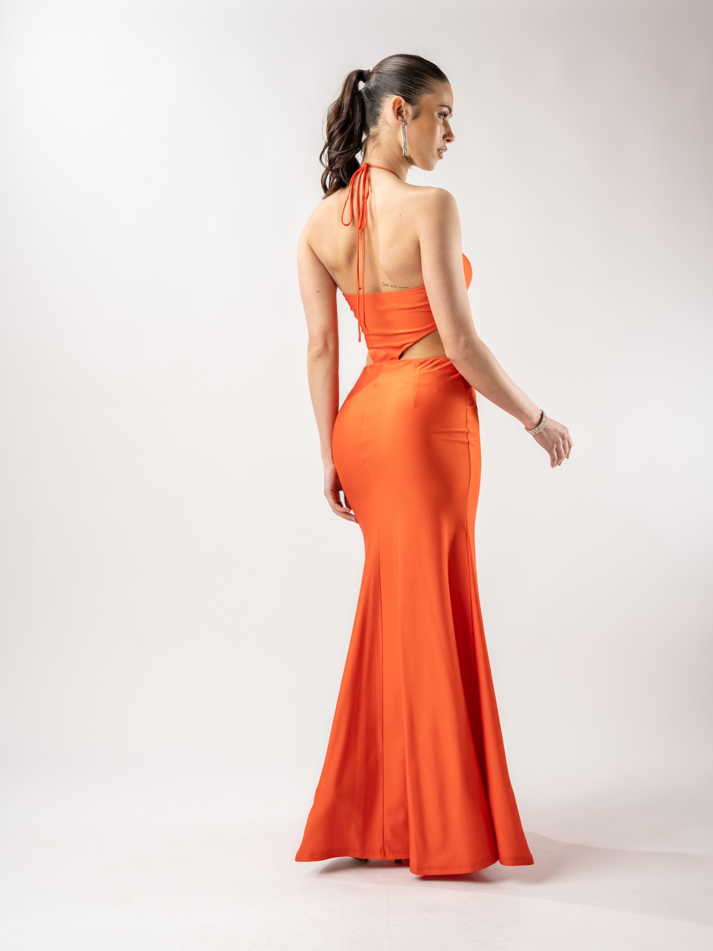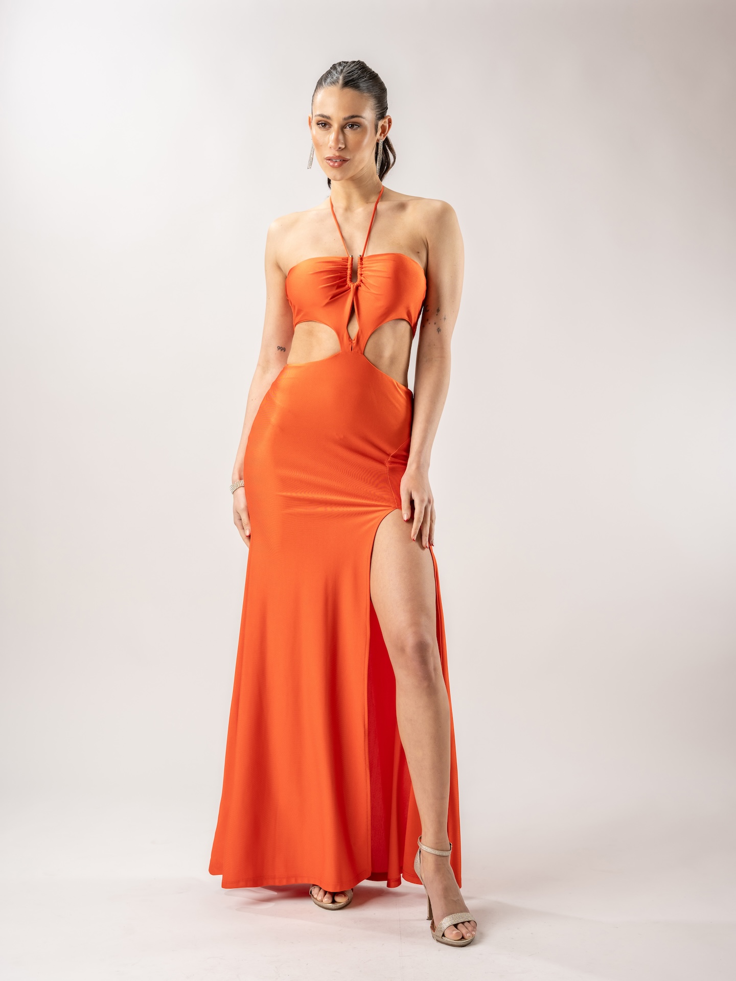 Vestido largo anatomico de Saten de Lycra con tajo delantero, con sustracciones centrales en delantero y espalda super sexies, pasador metalico en forma de U en escote, gerando frunces en la parte del busto, acompañado con tazas, espalda recta y tiras delanteras para atar en cuello.