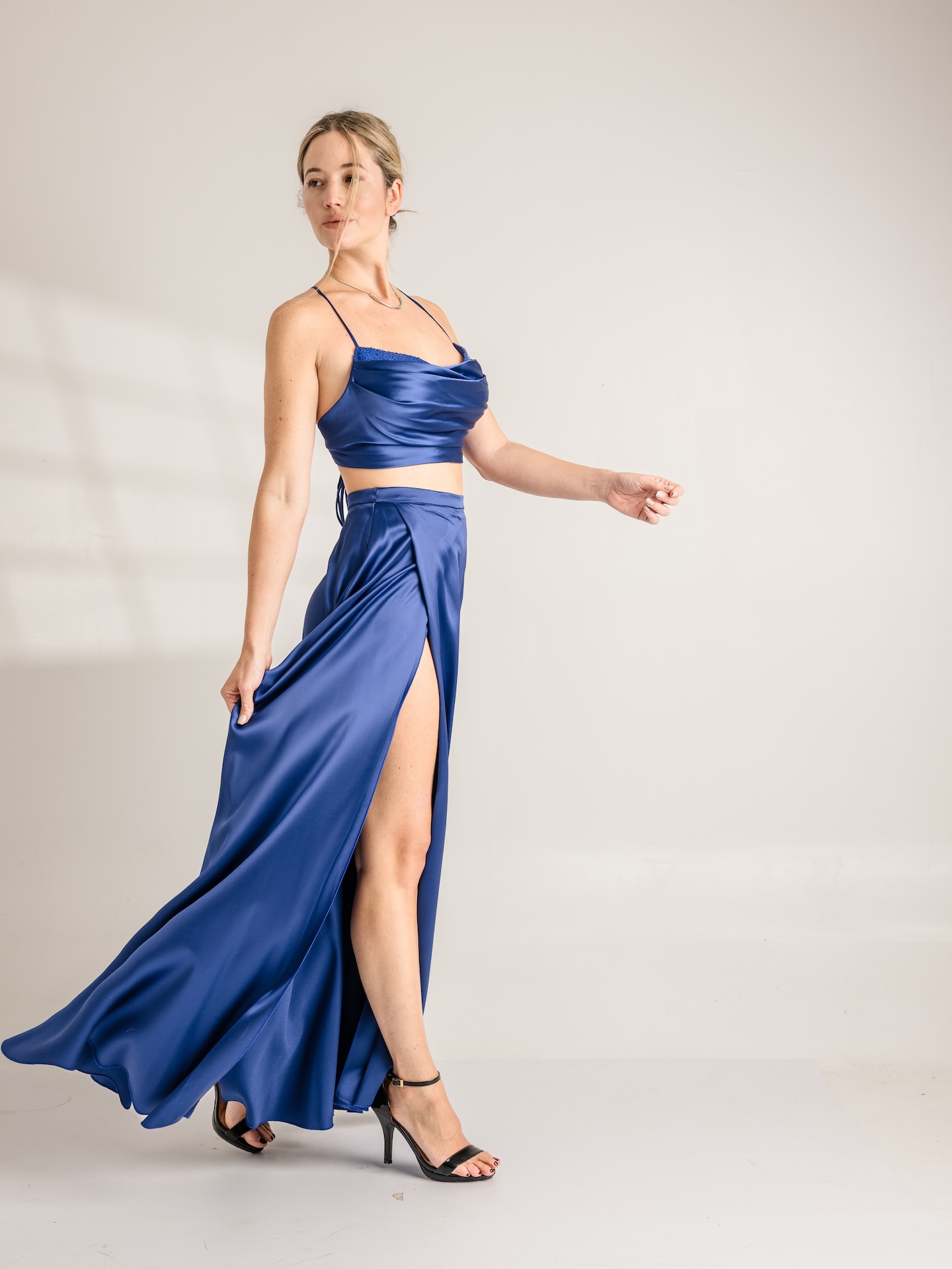 Conjunto top y falda en saten de alta calidad. Top drapeado en forma de buche con vista de lentejuelas. Una creacionoriginal, juvenil y de gran elegancia.