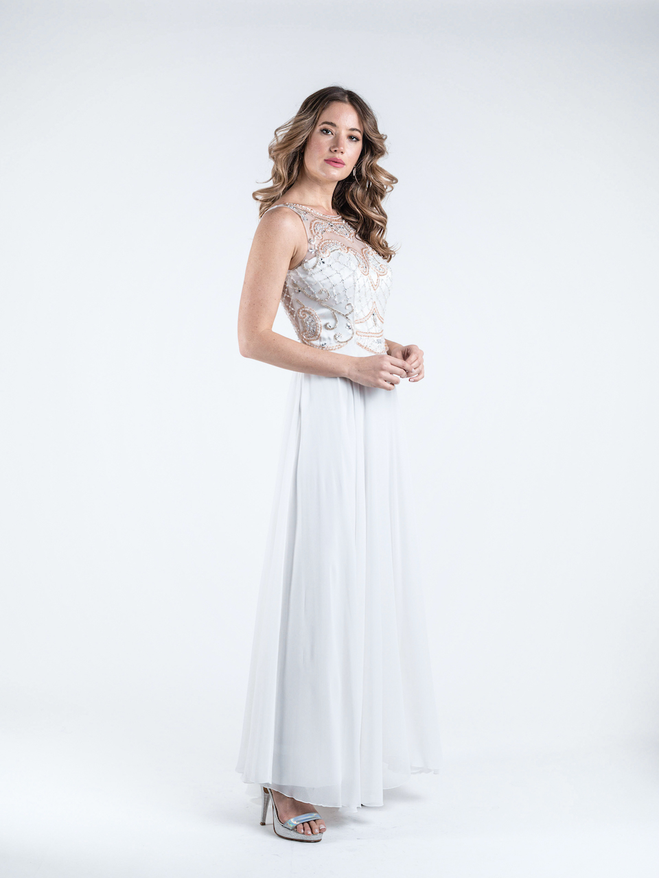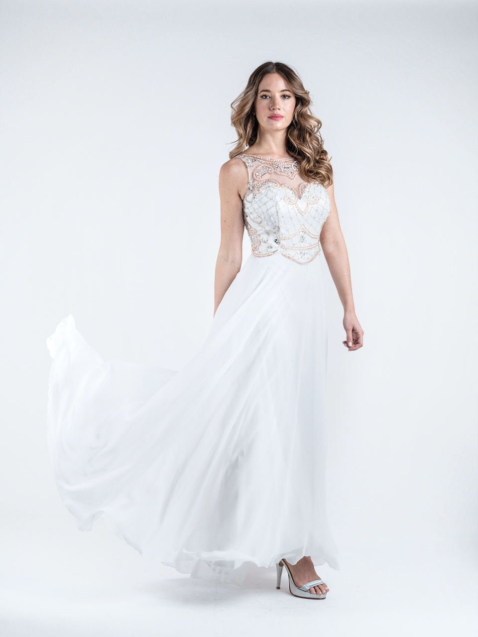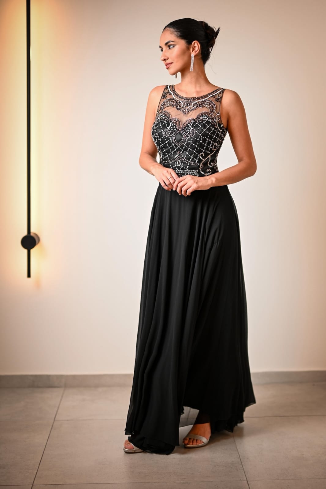 Romántico y sofisticado: Vestido largo con falda campana de gasa, ideal para un look etéreo y elegante. Su busto bordado con detalles delicados realza el escote corazón y deja el pecho libre para un toque audaz y femenino. La espalda en «O» aporta sensualidad con una silueta armónica y moderna.
