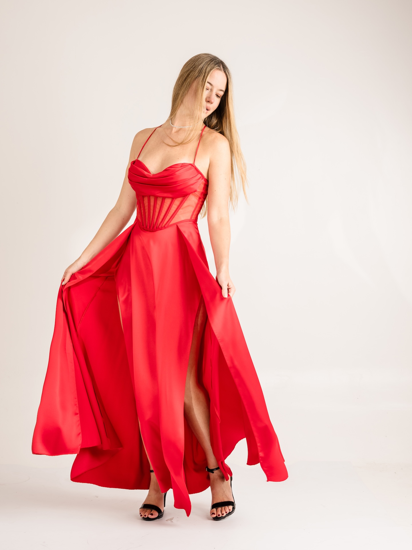 Este vestido largo es una declaración de elegancia y sensualidad. Confeccionado en satén, combina un escote drapeado tipo «cowl» con corsetería visible en tul y ballenas forradas a la vista que definen la figura y realzan el busto. La espalda se luce completamente con un diseño cruzado de tiras finas, lo que permite una mejor sujeción y adaptabilidad al cuerpo. La falda amplia con doble tajos le da movimiento y protagonismo en cada paso.