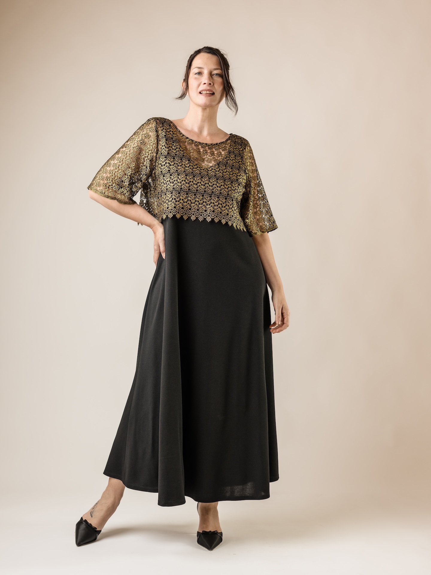 Vestido largo de crep con capa superpuesta en guipur dorada unicamente.