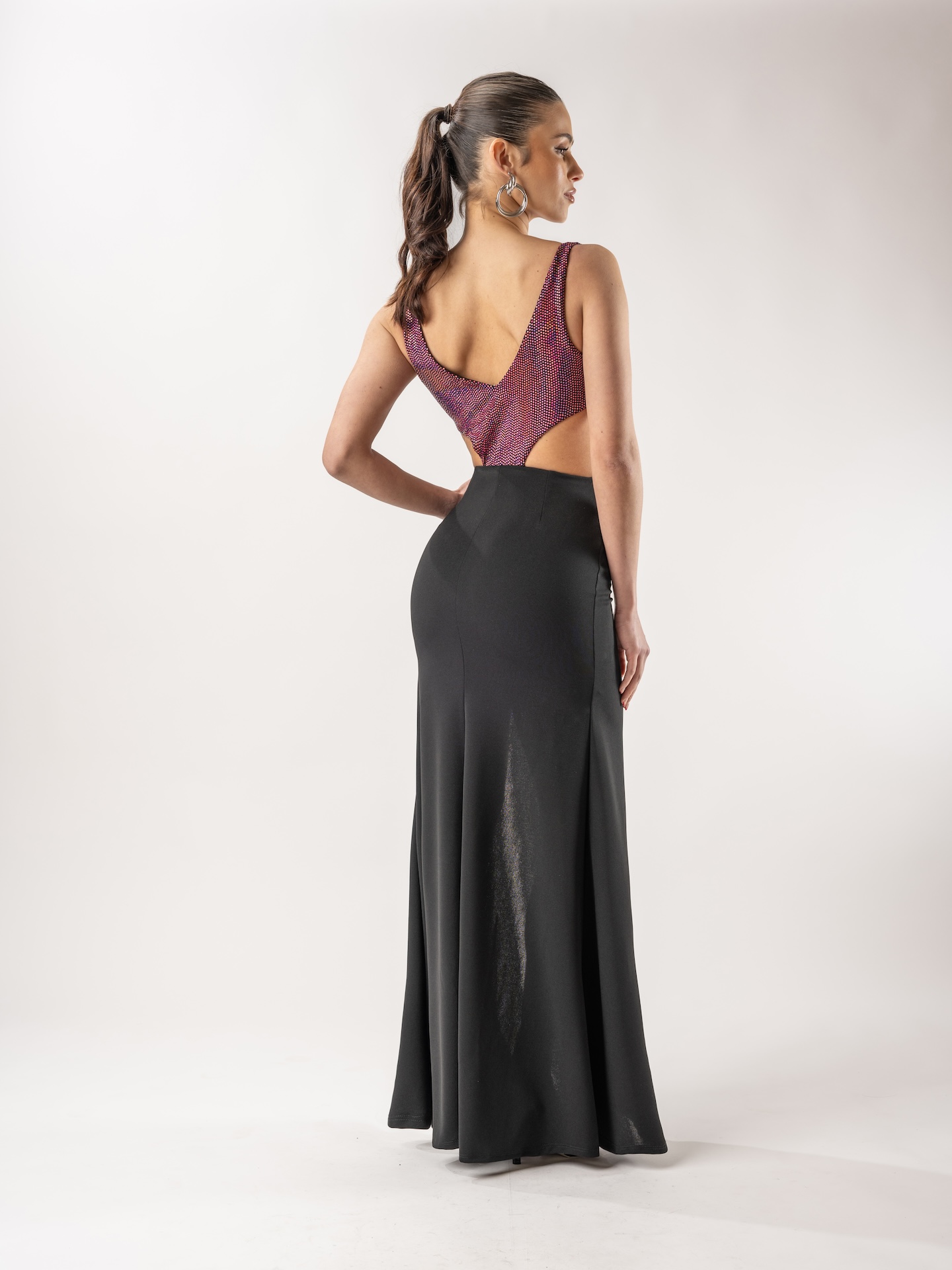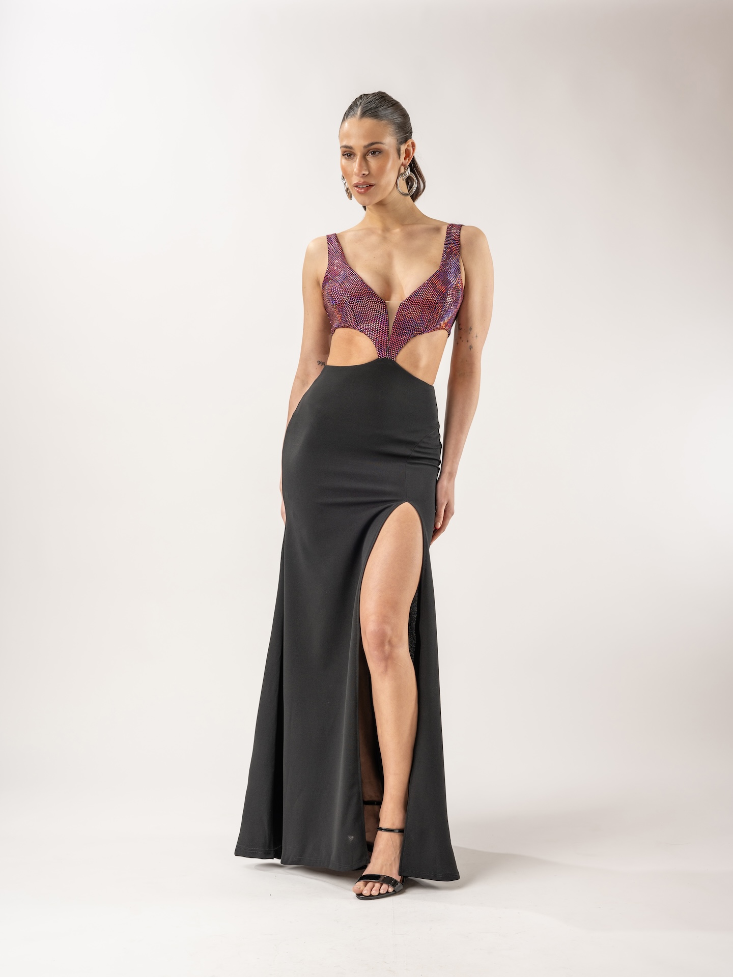 Vestido con silueta anatomica, y falda evase de crepe y parte superior de microfibra foil, con detalle de triangulo en escote de tul color piel, recortes y taza en busto y sustracciones en el delantero y espalda superiores para realzar la figura y silueta, tajo sexy delantero en falda.