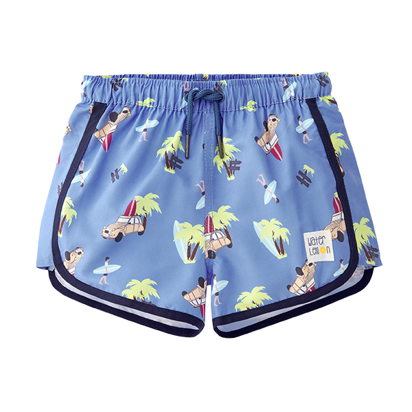 Bañador corto de niño estilo rocky con cinturilla elástica y cordones ajustables. Estampado de surf.