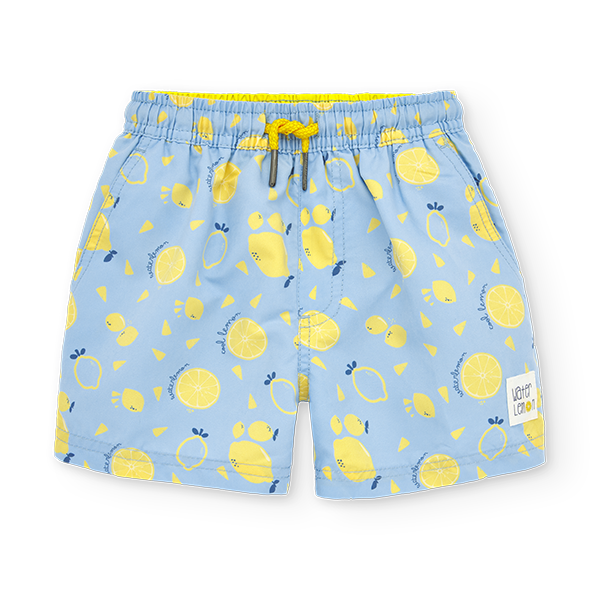 Bañador infantil con cordones ajustables, bolsillos laterales y bolsillo trasero con cierre de velcro.