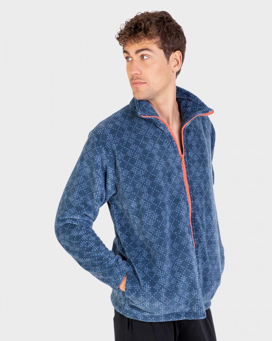 Bata corta de coralina para caballero. Con estampado en azul, cierre de cremallera y bolsillos.
