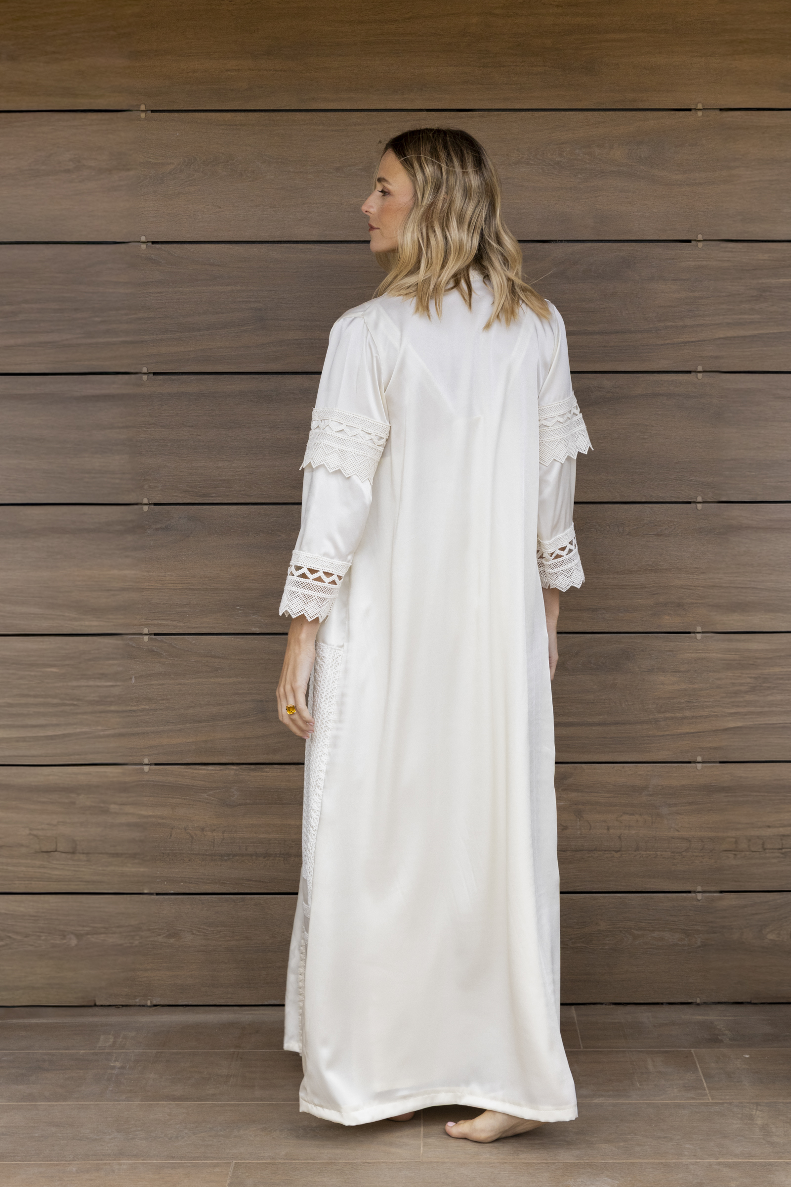 Una pieza única confeccionada en satén de tacto suave y caída fluida, realzada con delicadas inserciones de bordados en algodón que aportan contraste, textura y distinción.