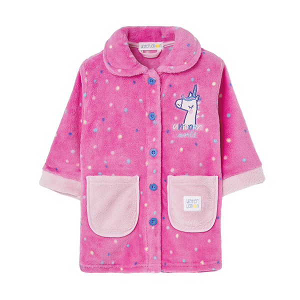 Bata infantil de coralina en fucsia con bordado de unicornio y estampado de puntitos. Cierre con botones y parte delantera con bolsillos.