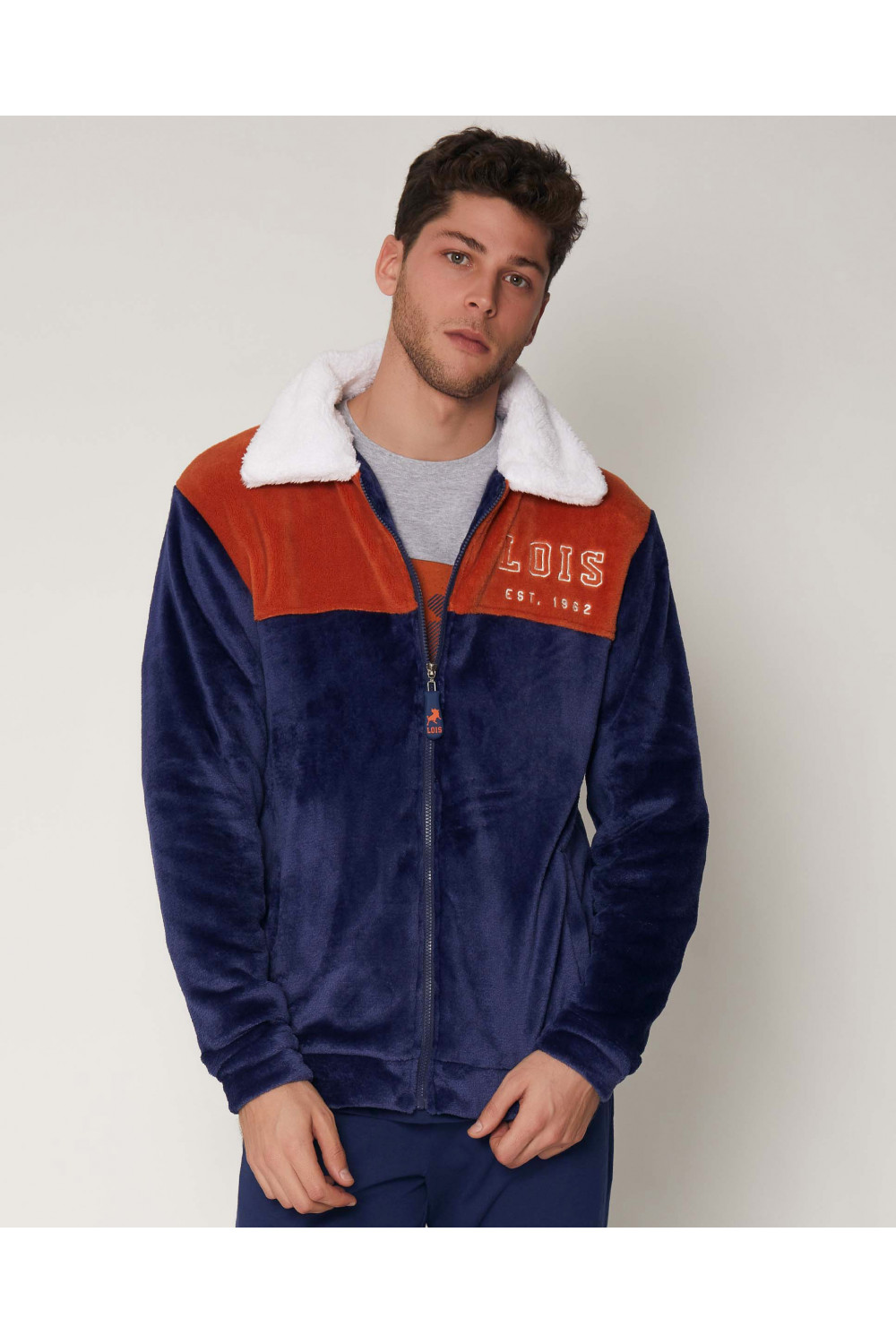 Bata corta de caballero de tejido polar azul marino con franja de la marca Lois. Cierre con cremallera y bolsillos delanteros.
