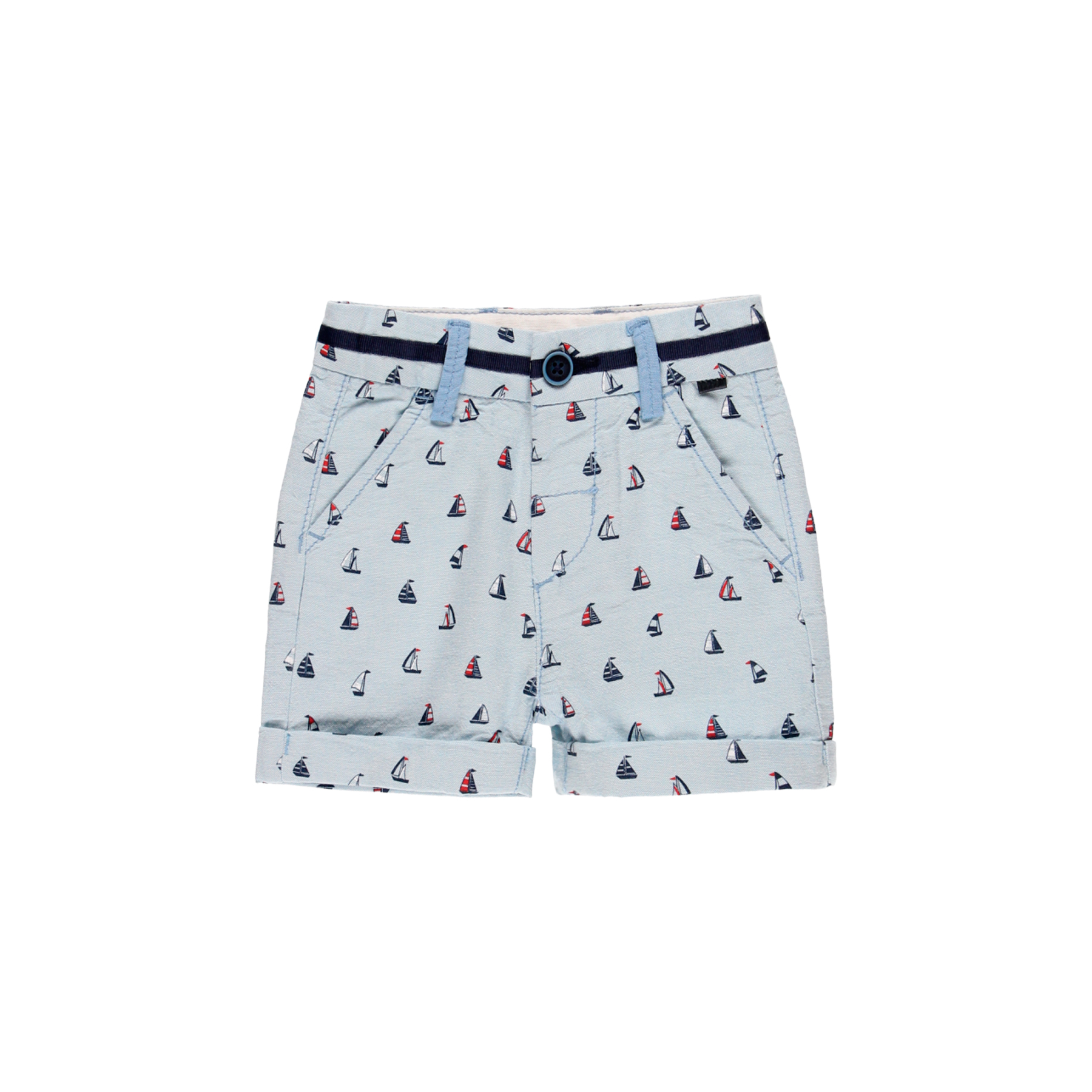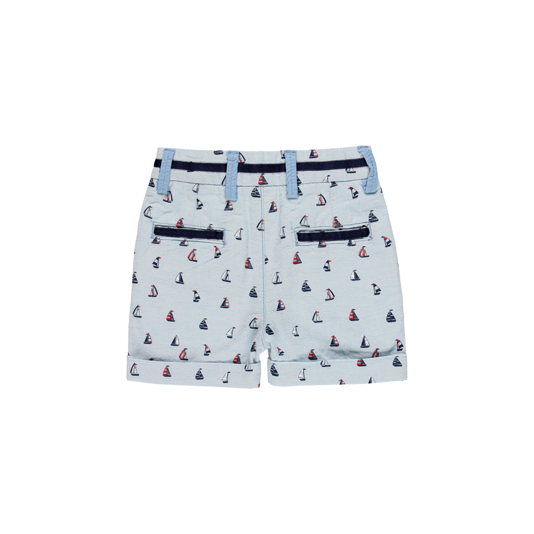 Bermuda en tejido de oxfrod en color azul con estampado de veleros. La bragueta se abrocha con botón y cremallera. La cintura es ajustable con una goma elástica interior con ojales y un botón a ambos lados. La decoración es una cinta de gros-grain en la cinturilla. Los bolsillos son funcionales.