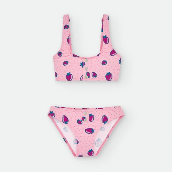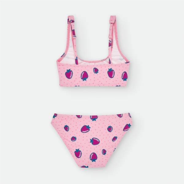 Bikini infantil rosa con estampado de fresas con la parte de arriba estilo top.