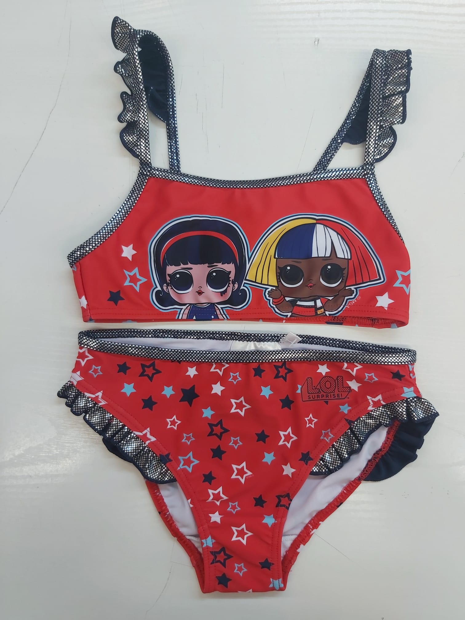 Bikini infantil con estampado de las muñecas LOL Surprise, con volantes y detalles en purpurina.