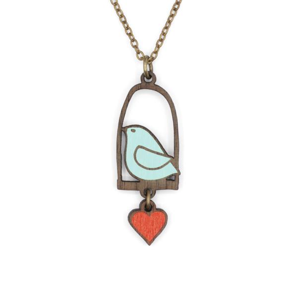 Colgante de madera de Nogal en forma de pajarito azul con corazón rojo. Collar pintado a mano. Medida colgante 1,7 x 4,3cm, cadena ajustable de 46 a 50cm.