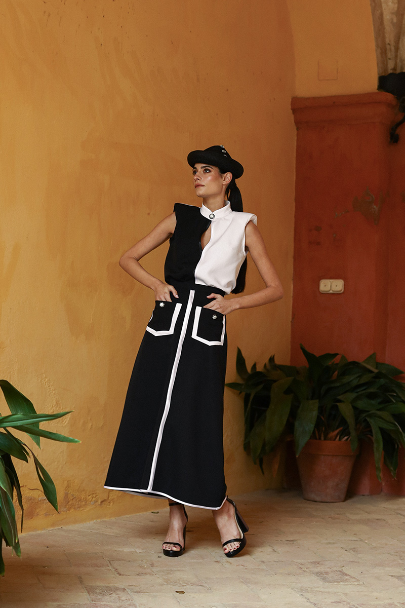Blusa confeccionada en crepe en dos colores, rematada a contraste en escote y sisa. Cuello mao, abertura en forma de lágrima en escote y botón joya a tono. Lleva hombreras pronunciadas en su interior. Combínala con Falda Oriana.