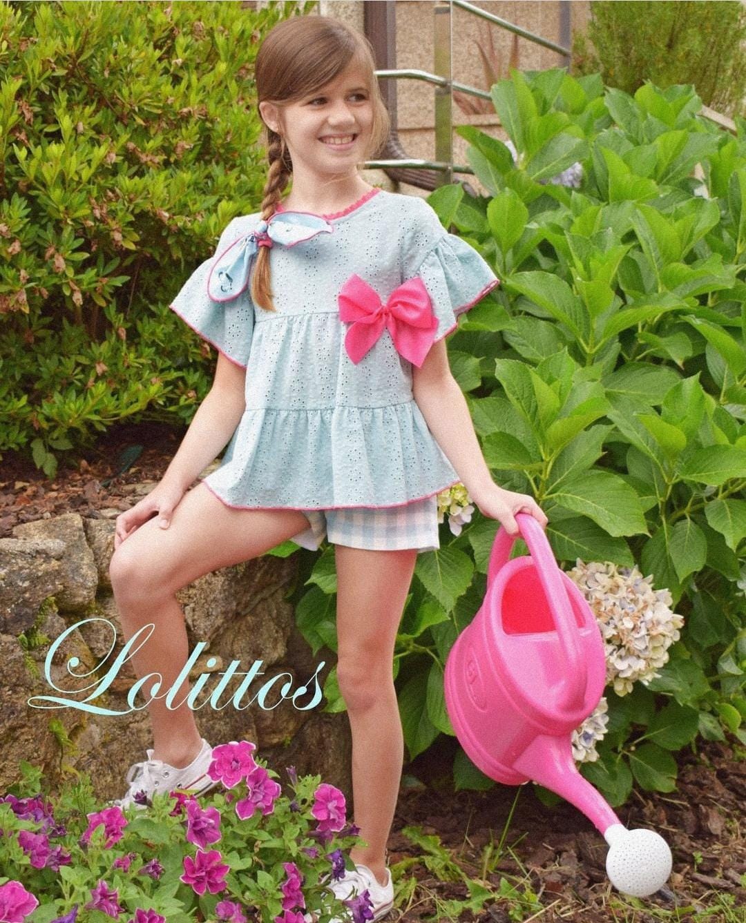 Blusón de niña color azul con detalles en fucsia