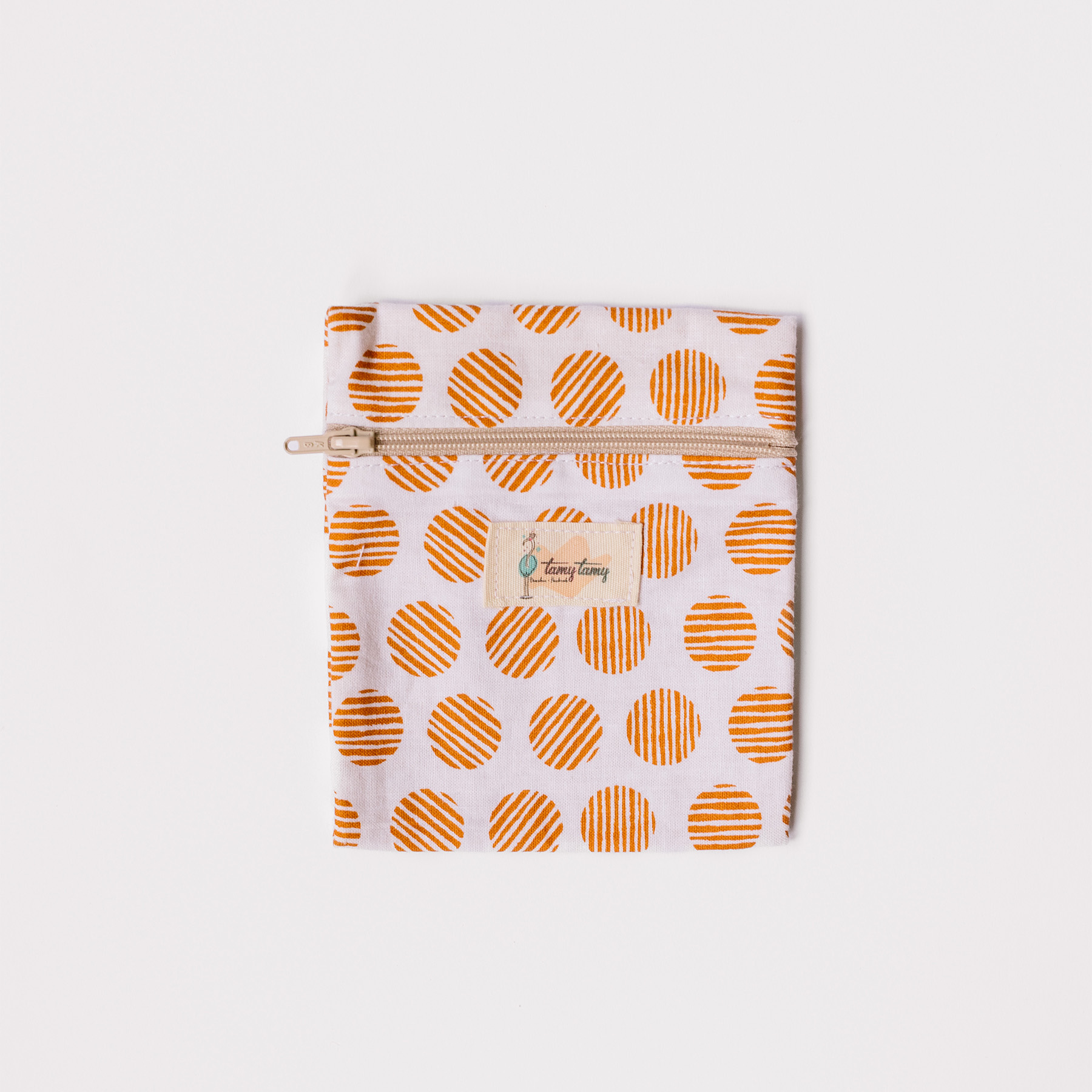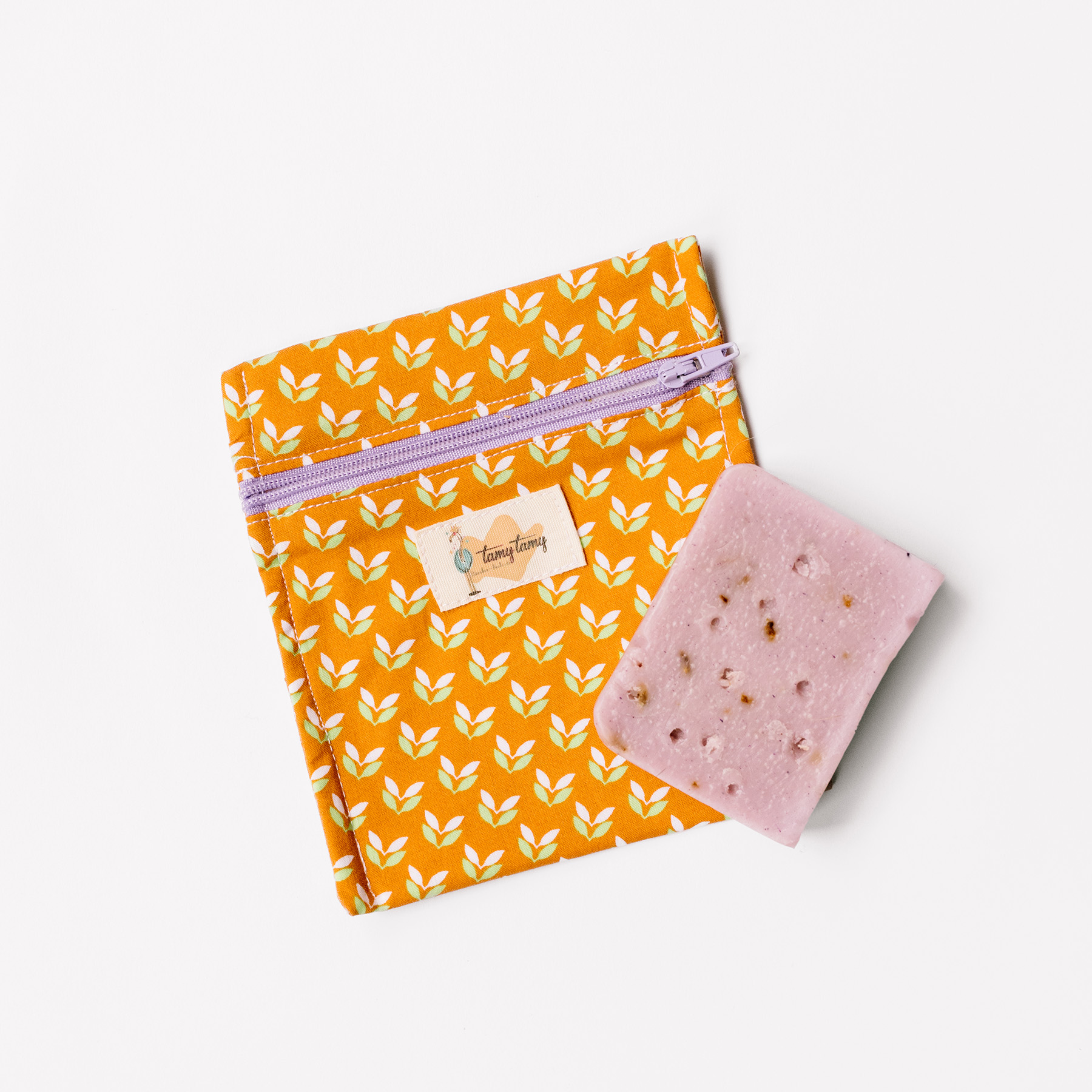 Exterior de algodón estampado 100% (certificado OEKO-TEX® Standard 100), interior impermeable y cierra con cremallera, dejando una pequeña apertura an los laterales de la cremallera para que la pastilla de jabón transpire y salga la humedad, de lo contrario la pastilla de desharía dentro de la bolsita.