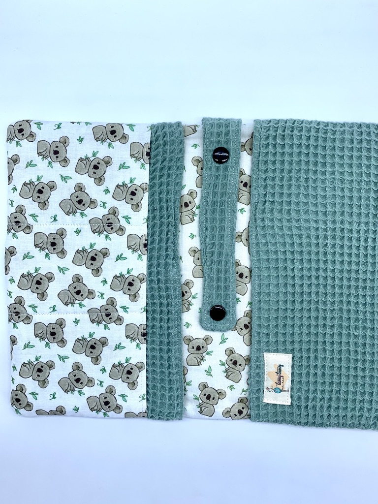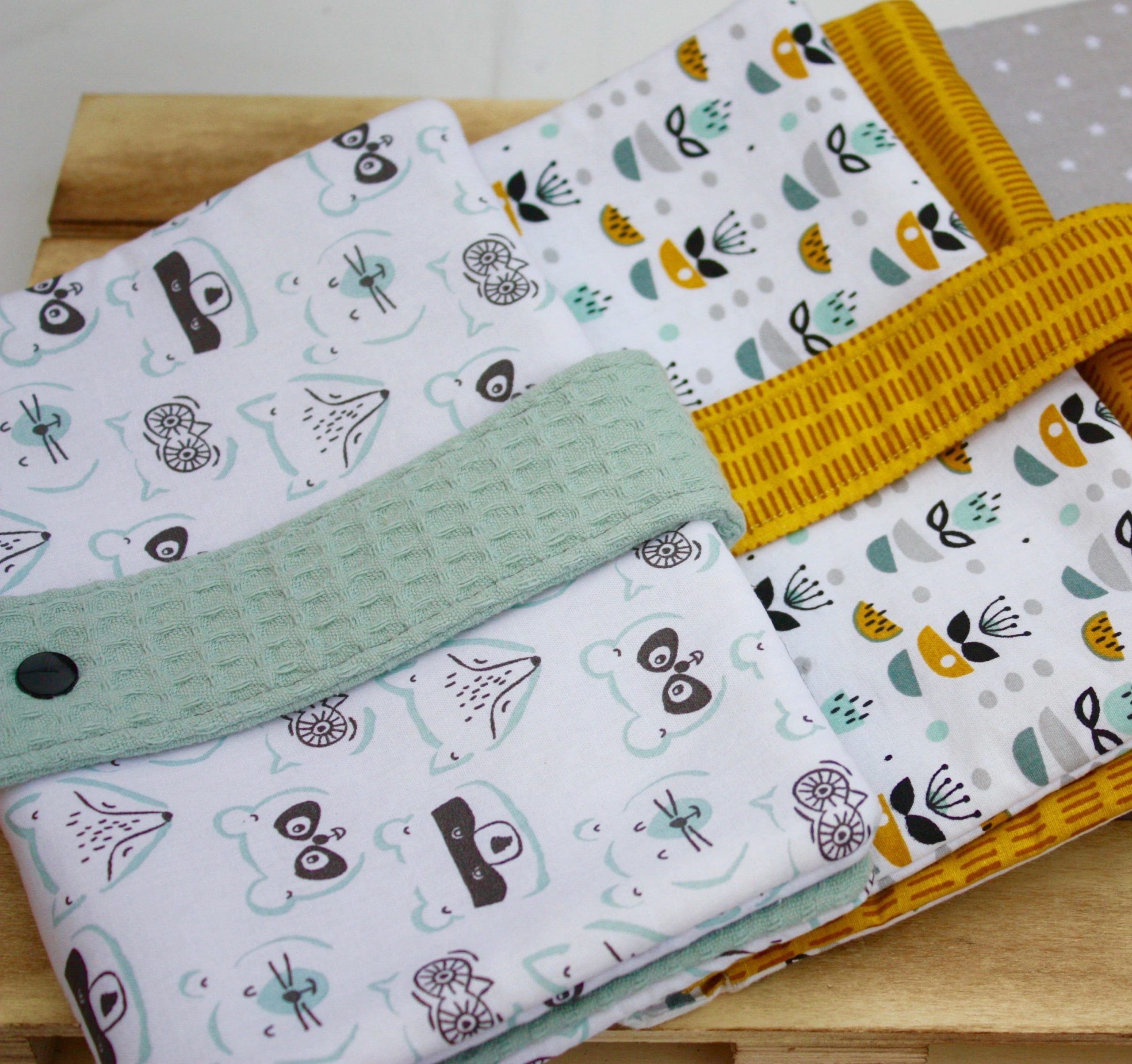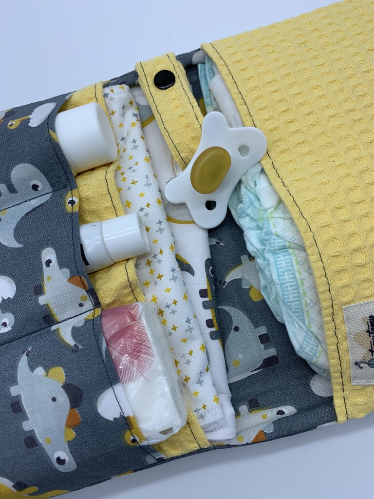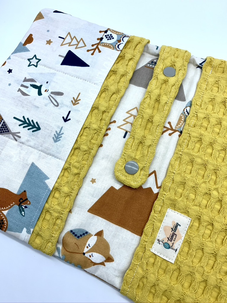 Todos los porta pañales están confeccionados a mano con algodón 100 % certificado OEKO-TEX® Standard 100 y con un relleno de boata de bambú que lo hace más mullidito y a su vez protege los objetos que hay en la bolsa.