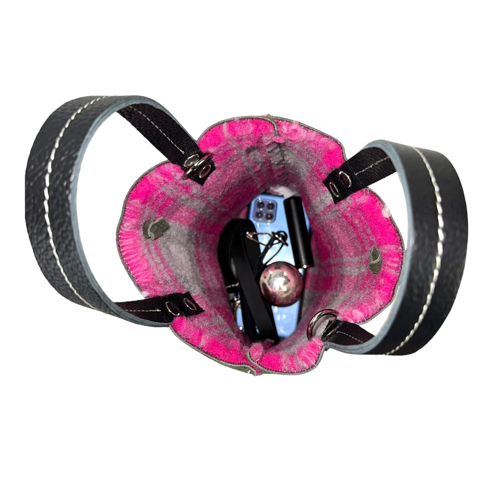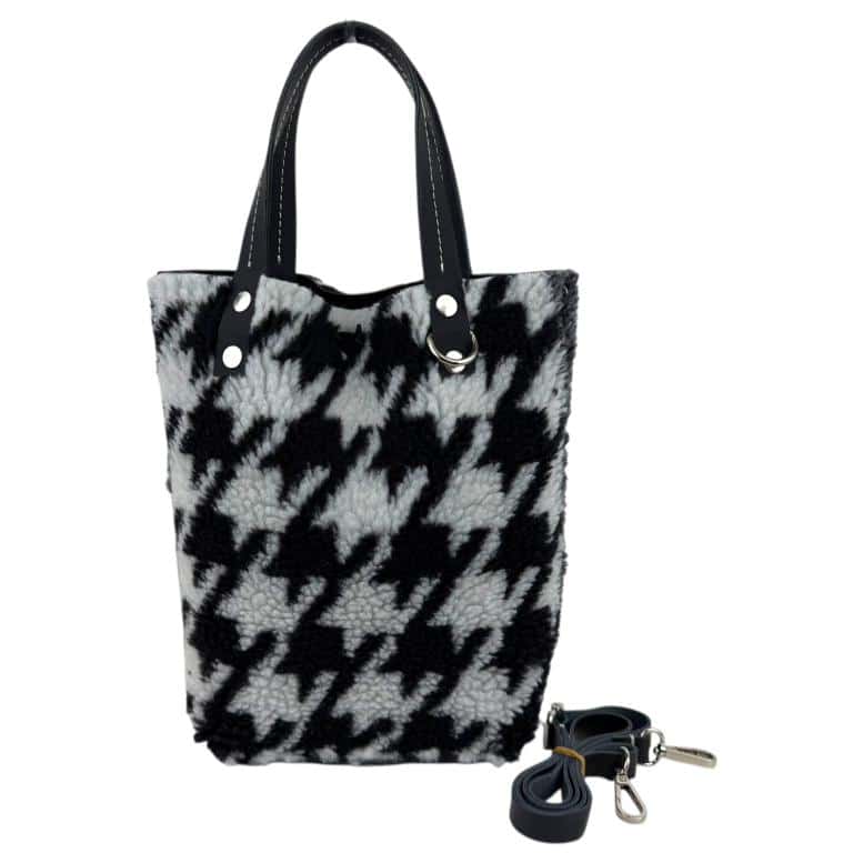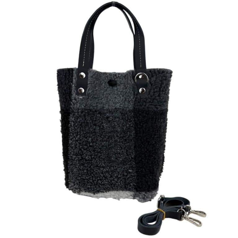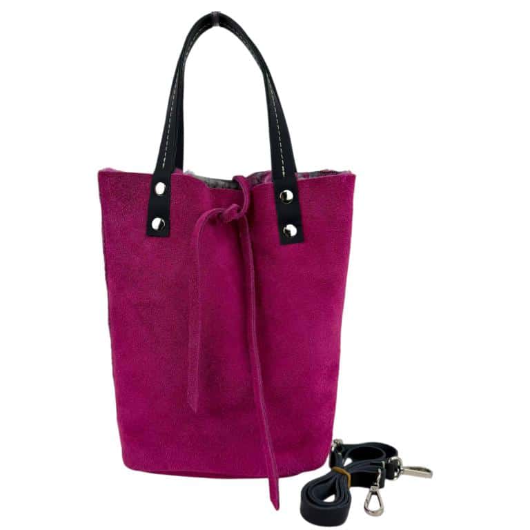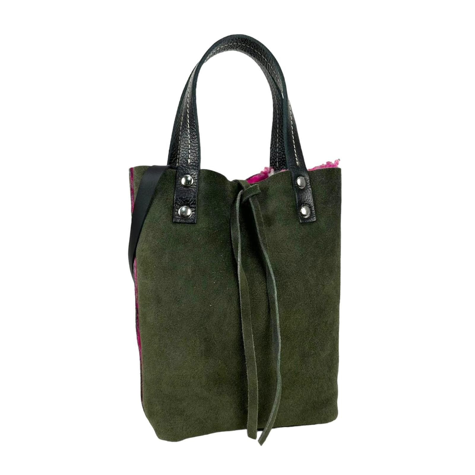 Bolso de Tercipelo y Piel de serraje reversible, con 2 asas de mano y una tira bandolera ajustable y extraible.