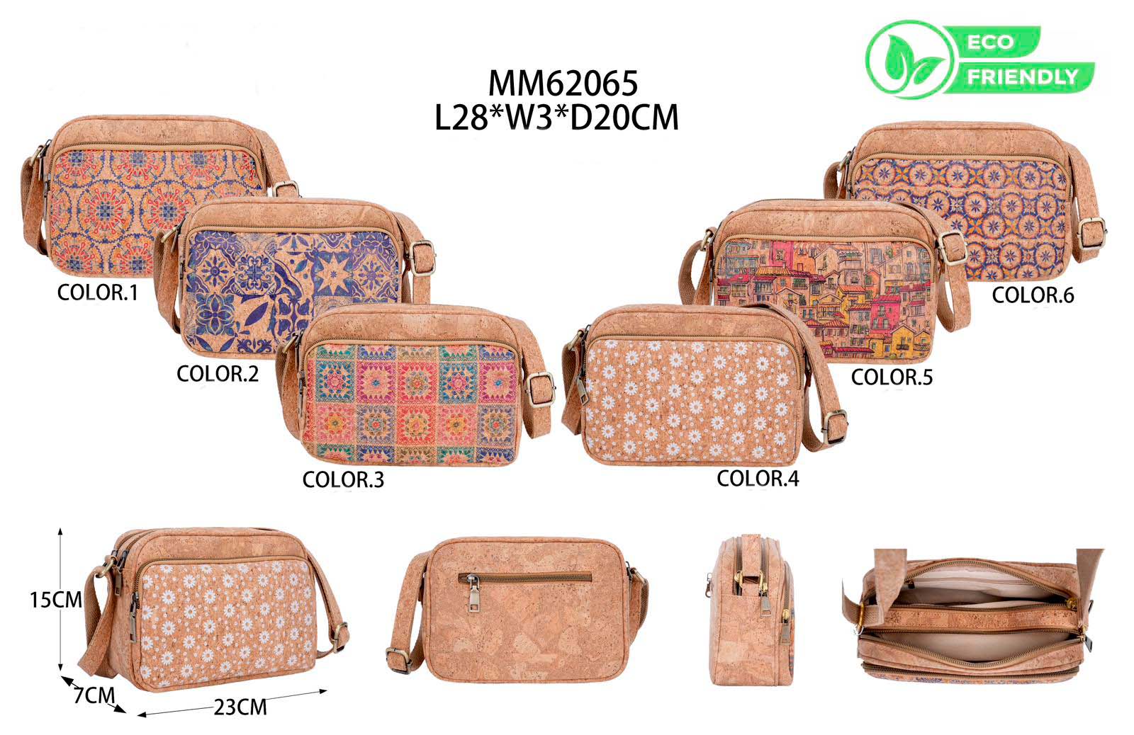 Bolso Bandolera Ecológico de Corcho Sintético para Mujer con 4 Compartimentos con Cierre de Cremallera.