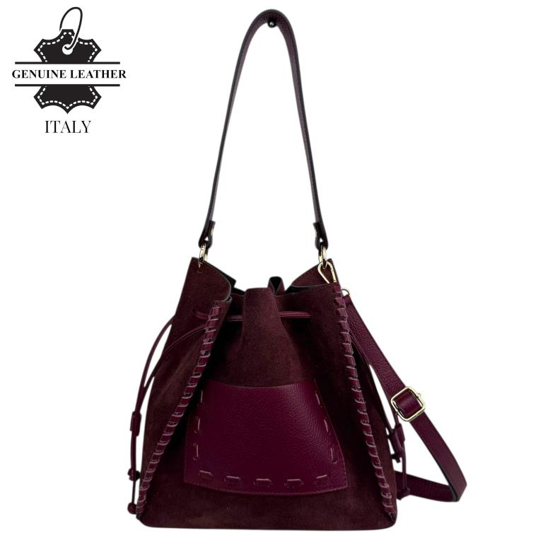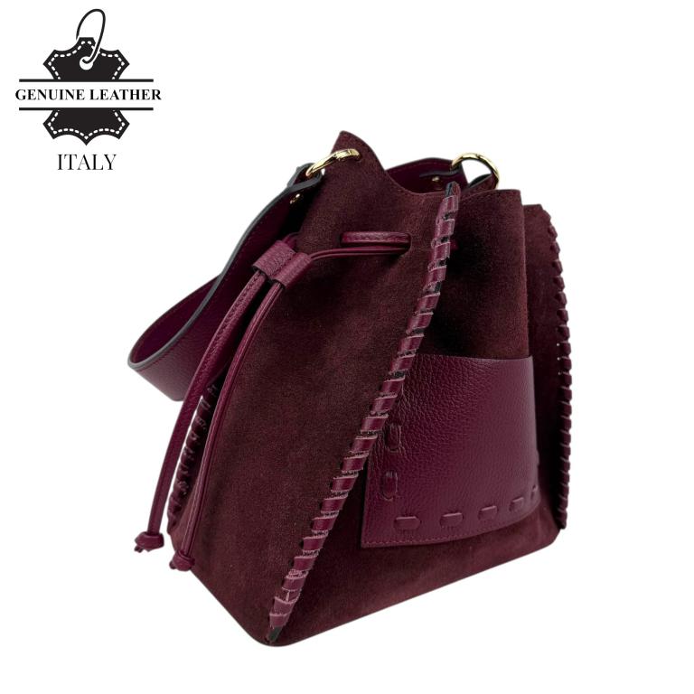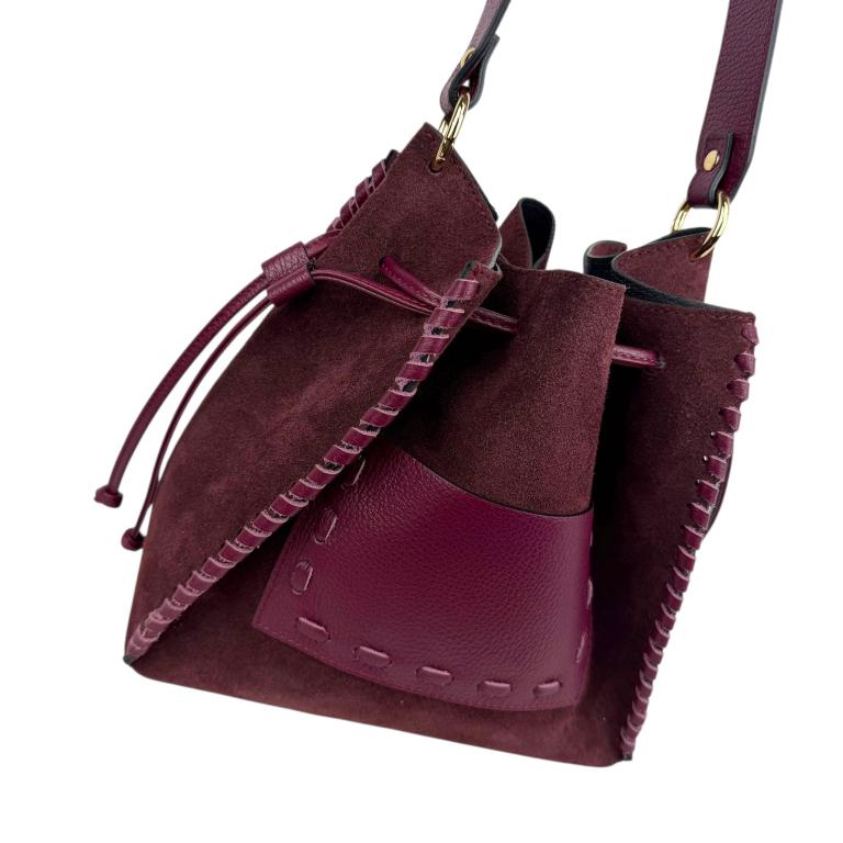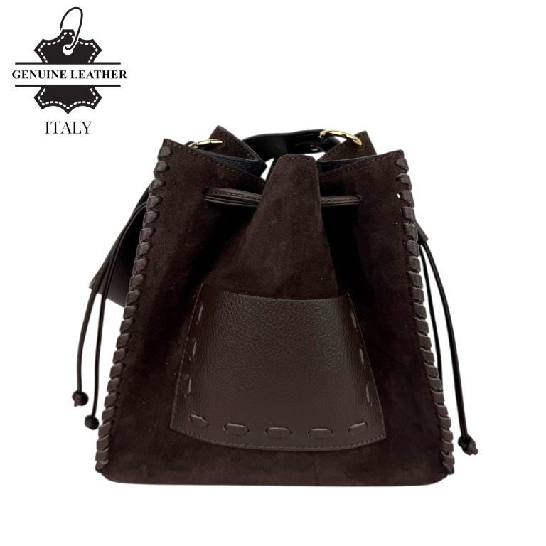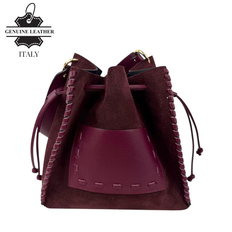 Bolso Bucket en Piel de Serraje con Compartimento Frontal y Cierre de Cuerdas para Mujer.