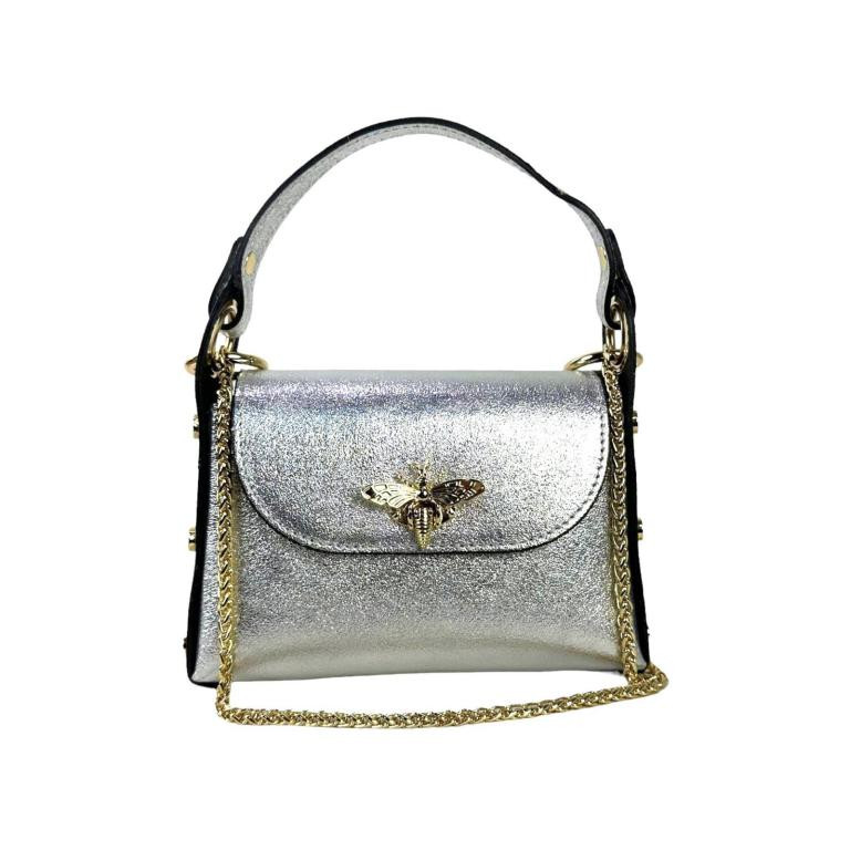 Bolso Compacto de Piel Metalizado Mujer con Tachuelas Decorativas Laterales, Solapa y Diseño de Abeja. Fabricado en Italia.