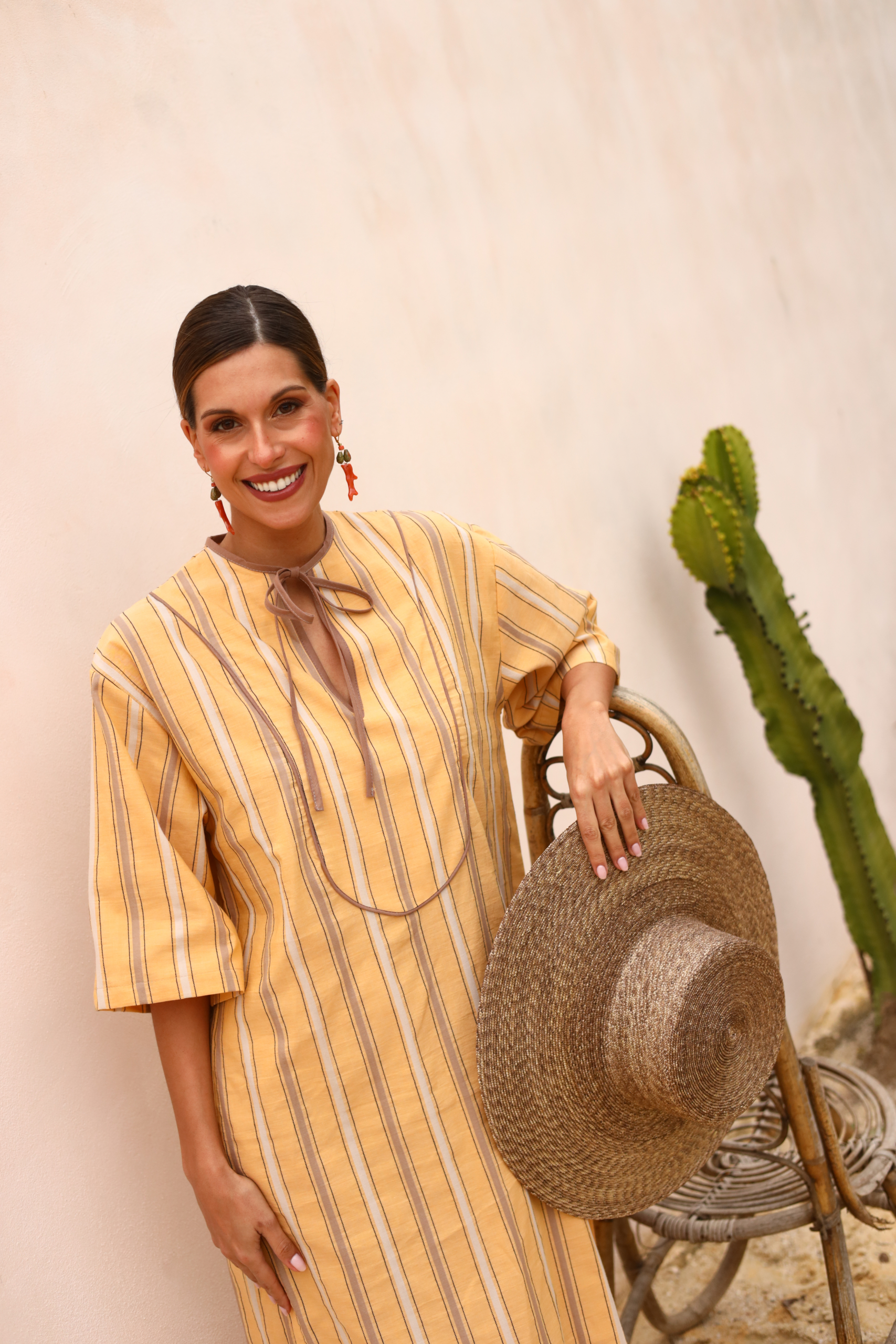 El diseño se eleva con un original rematado en cinta al bies, que recorre sutilmente los bordes del caftán, aportando un aire artesanal y distintivo, propio del cuidado que ponemos en cada una de nuestras piezas. Este pequeño detalle marca la diferencia y le da un toque de personalidad que lo convierte en una prenda única.