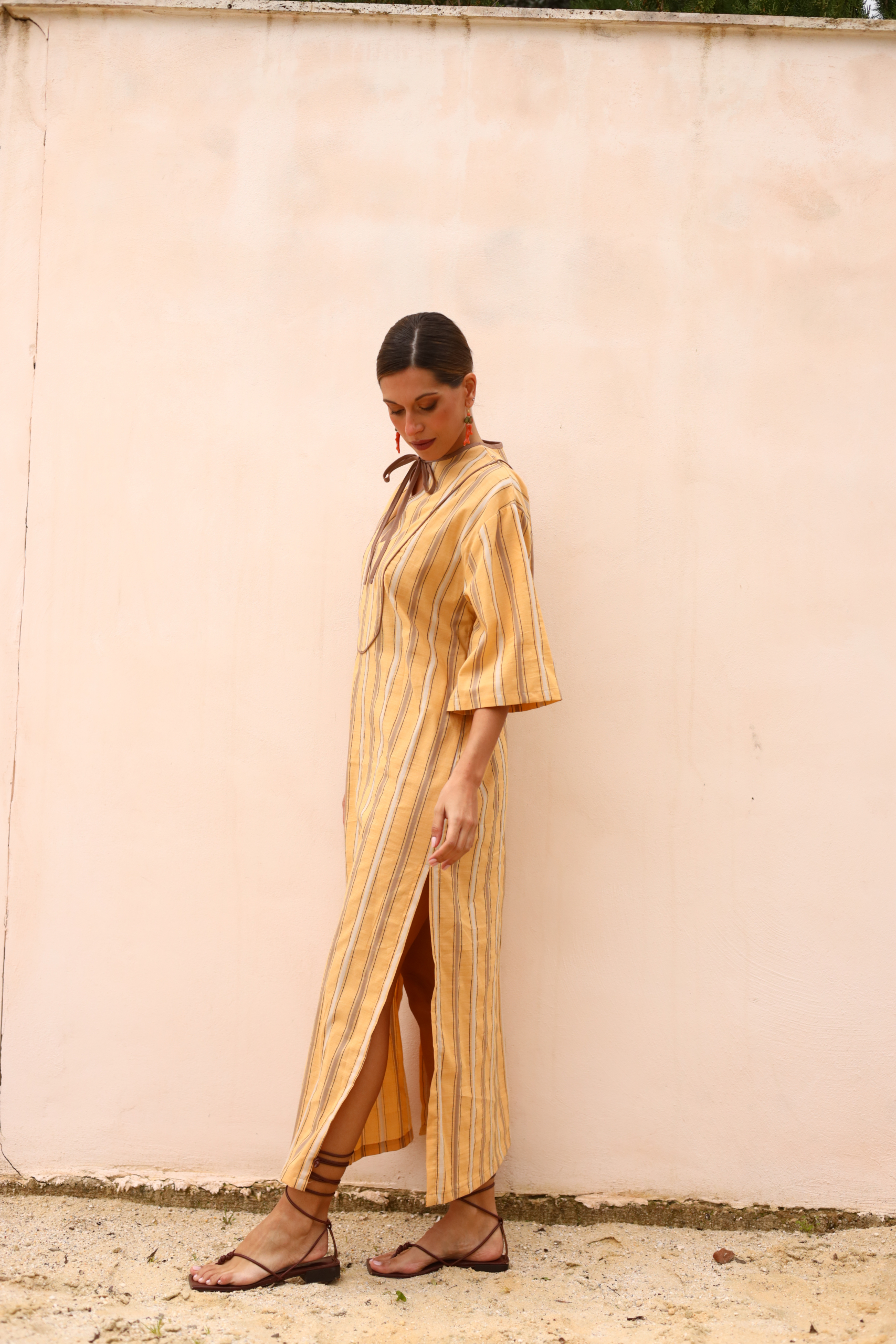Se abrocha con una delicada lazada frontal, permitiendo ajustarlo al cuerpo de forma natural, manteniendo su esencia relajada y versátil. Además, sus aberturas laterales no solo añaden un punto de sofisticación y ligereza visual, sino que también favorecen el movimiento y aumentan la comodidad, haciendo de esta pieza una opción ideal tanto para estar en casa, como para un paseo al atardecer, un día de playa o una cena informal.