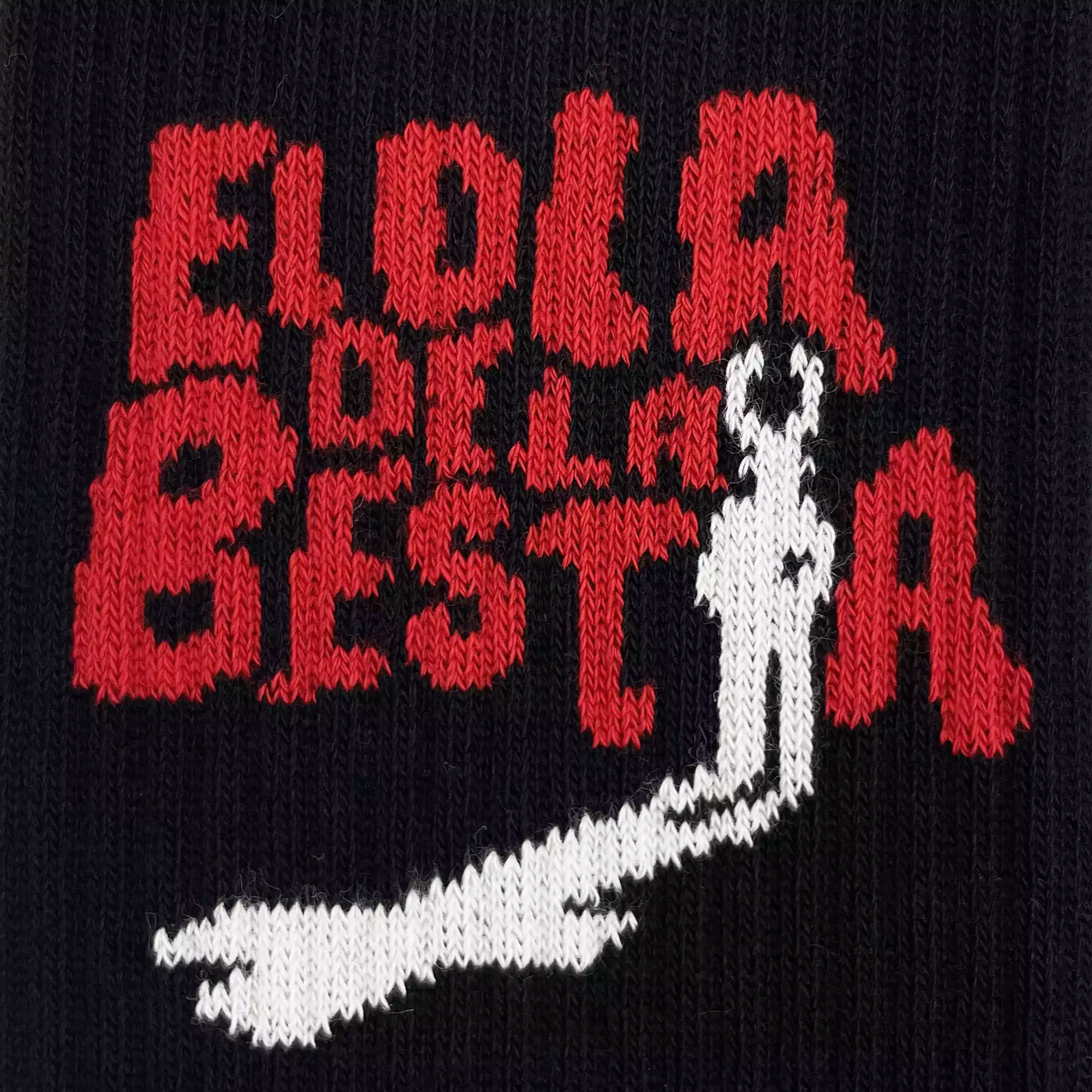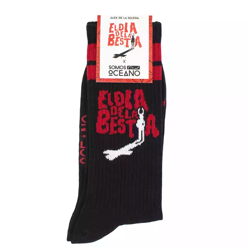Calcetines deportivos negros con el icónico y reconocible cartel de El día de la bestia de la película de Álex de la Iglesia confeccionados en suave algodón «satánico».