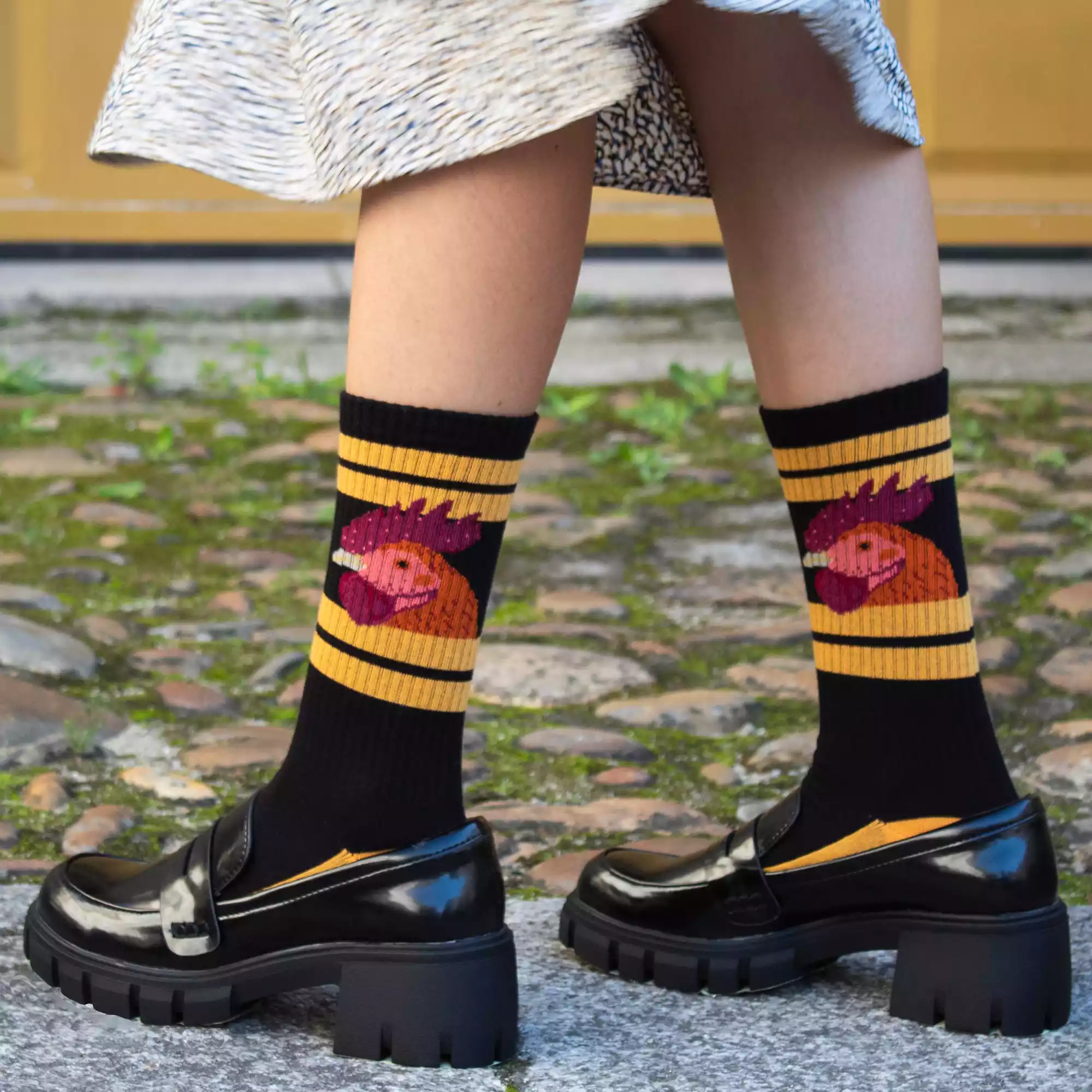 Estos calcetines deportivos tienen un aire retro pero con un punto contemporáneo y alegre porque están coronados por un orgulloso gallo: ¡tus sesiones en el gimnasio ya no van a ser iguales!