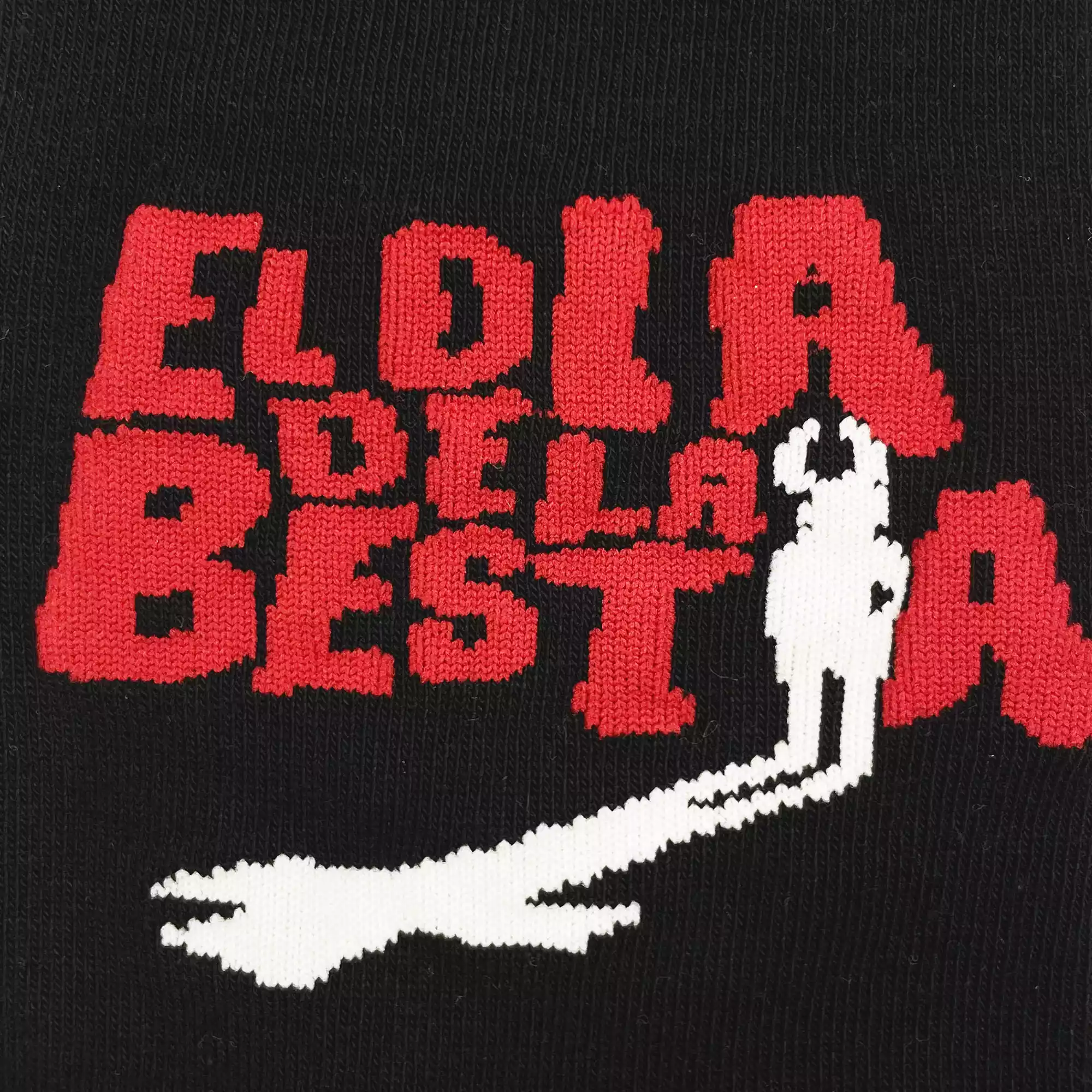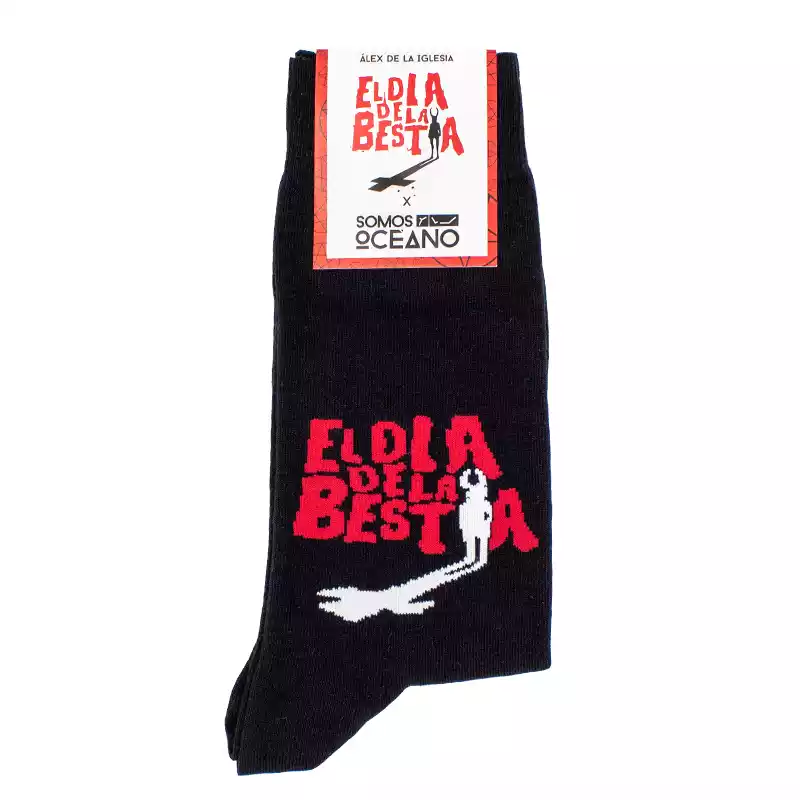 Calcetines negros con el icónico y reconocible cartel de El día de la bestia de la película de Álex de la Iglesia confeccionados en suave algodón «satánico».
