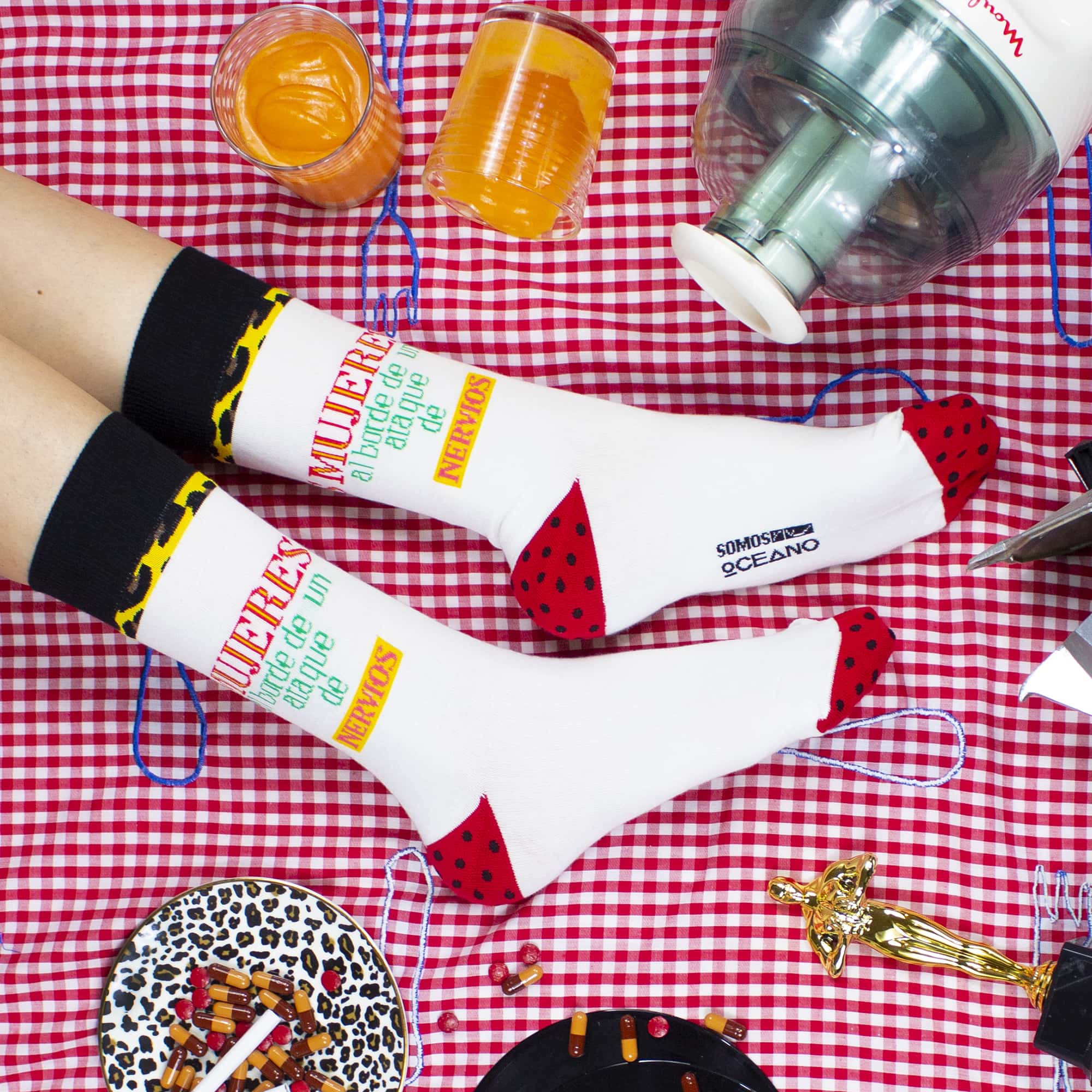 Mujeres al borde de un ataque de nervios (1988) supuso el lanzamiento internacional de la imparable carrera de Pedro Almodóvar; este modelo de calcetines recoge todo el colorido y efervescencia de la película.