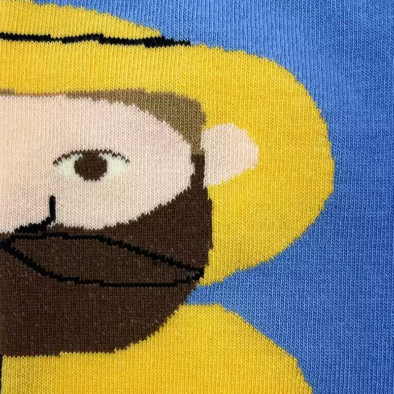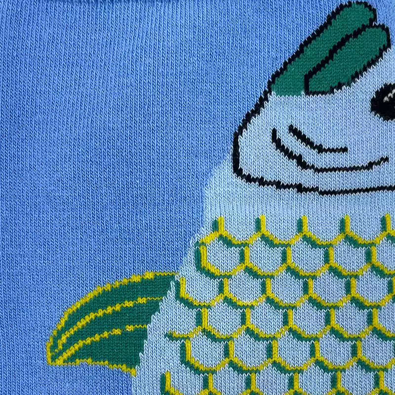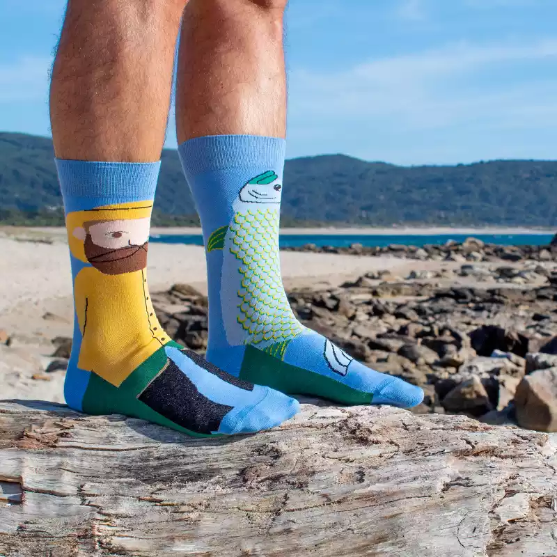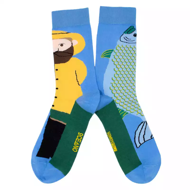 En un pie un pescado fresco y en el otro pie, un marinero preparado para la faena. Divertidos calcetines desparejados con fondo en algodón azul claro.