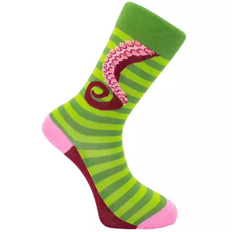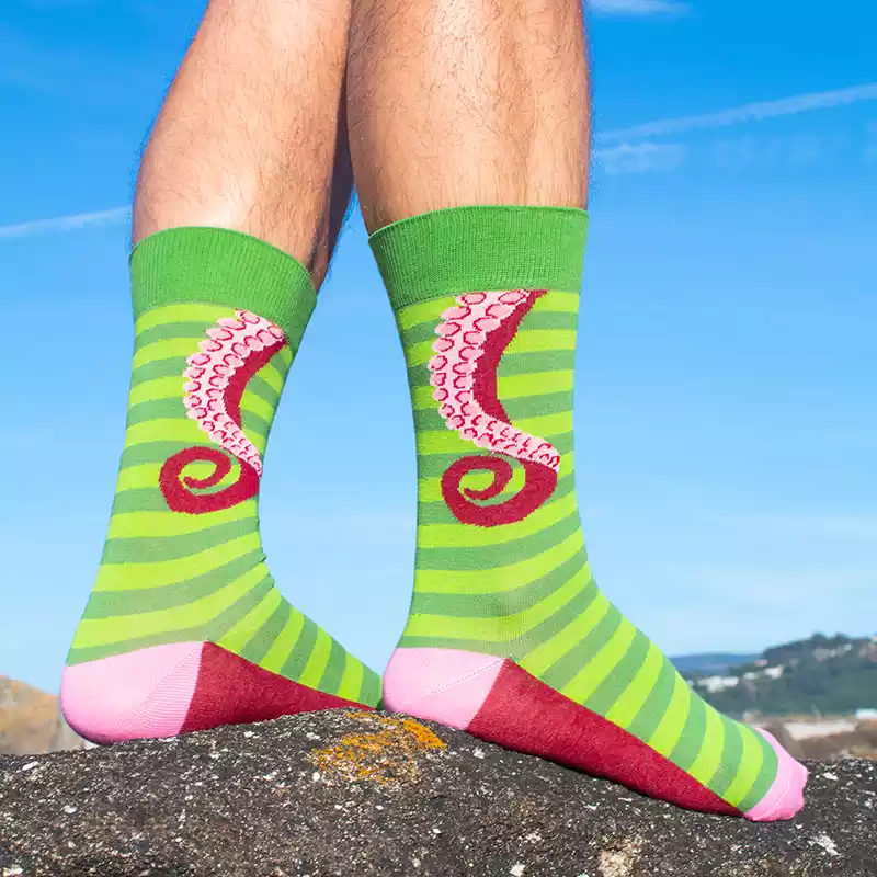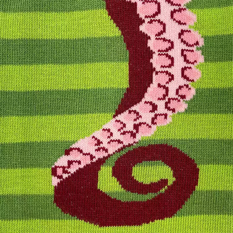 Con frescas rayas verdes, detalles en rosa, y un tentáculo de pulpo asomando por la pierna: ¡tan llamativos como divertidos!