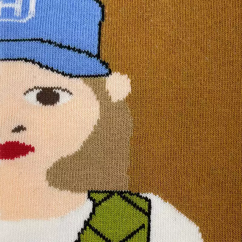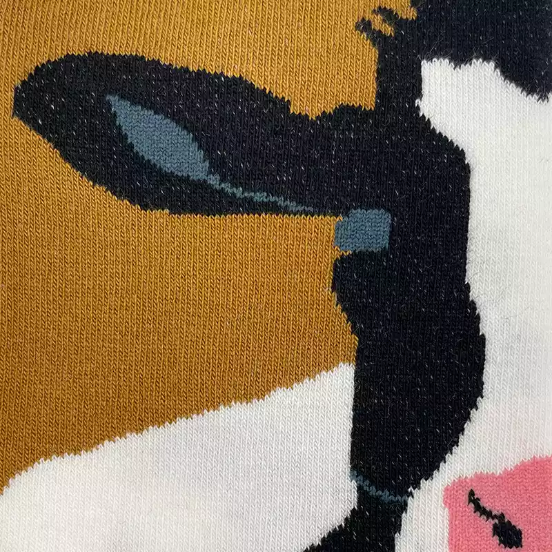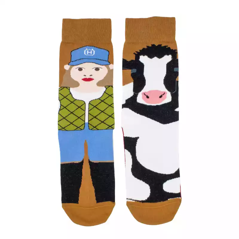 En un pie, una vaca con manchas y en el otro pie, una ganadera preparada para la faena. Divertidos calcetines desparejados con fondo en algodón tierra.
