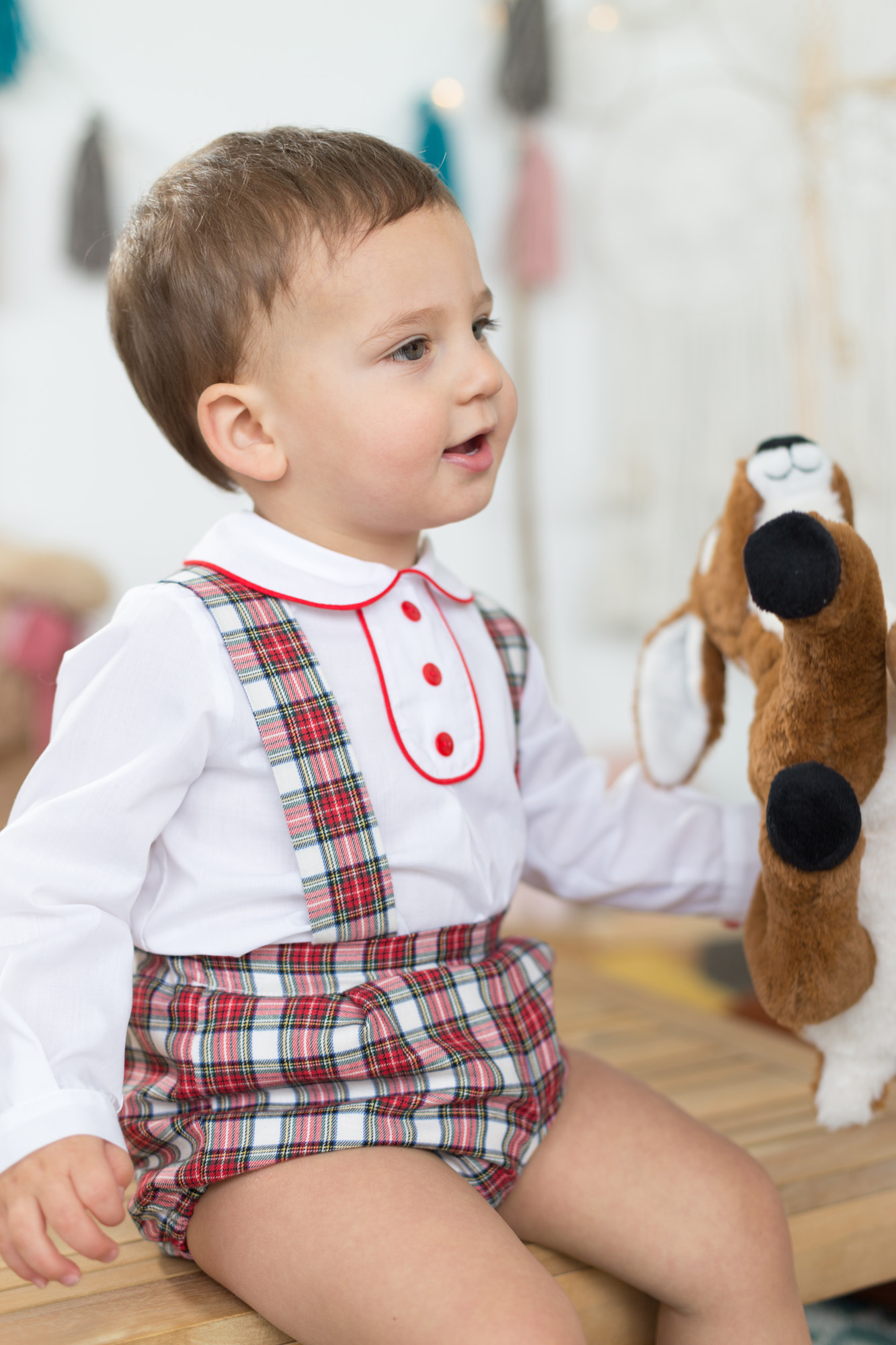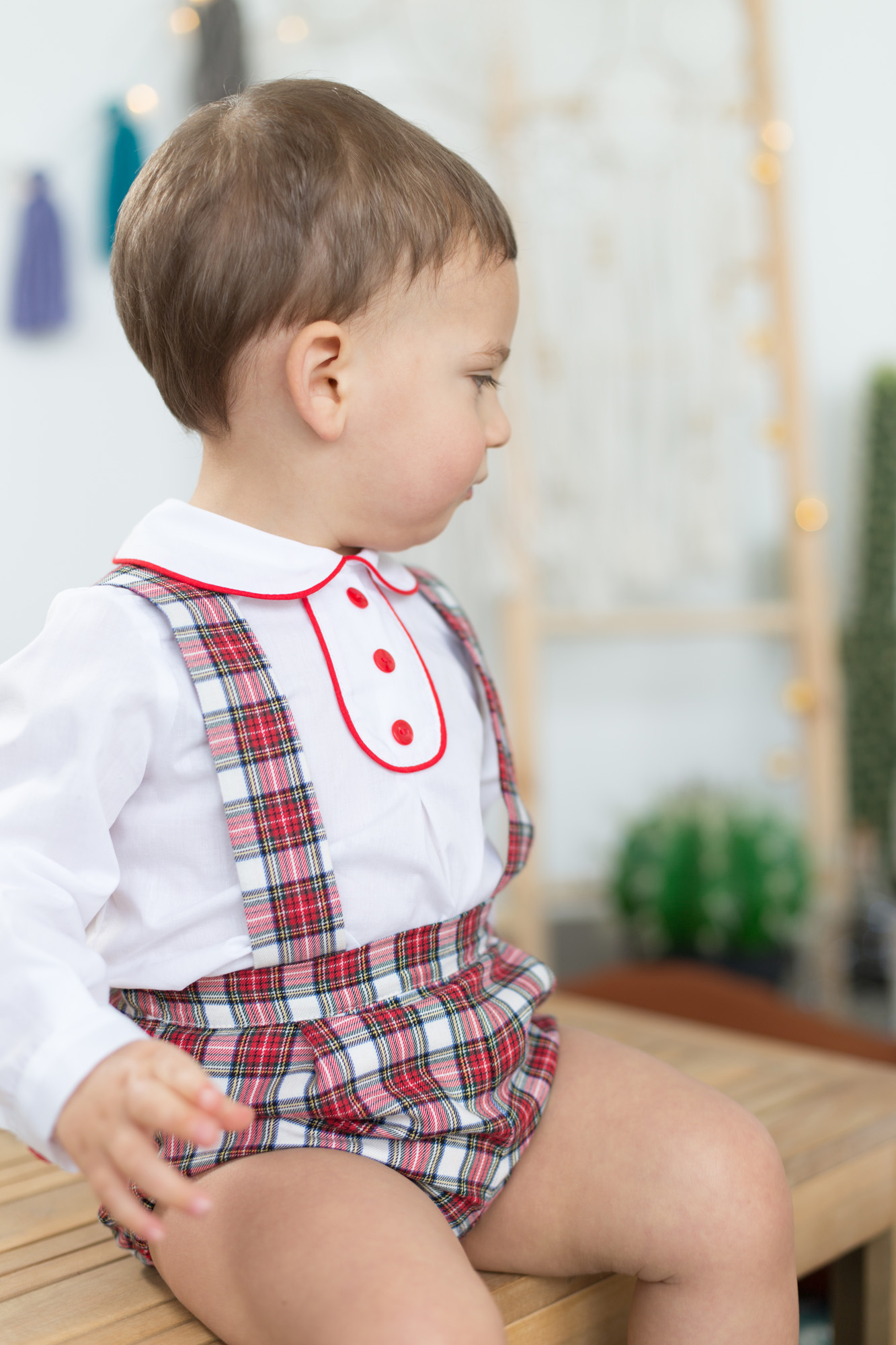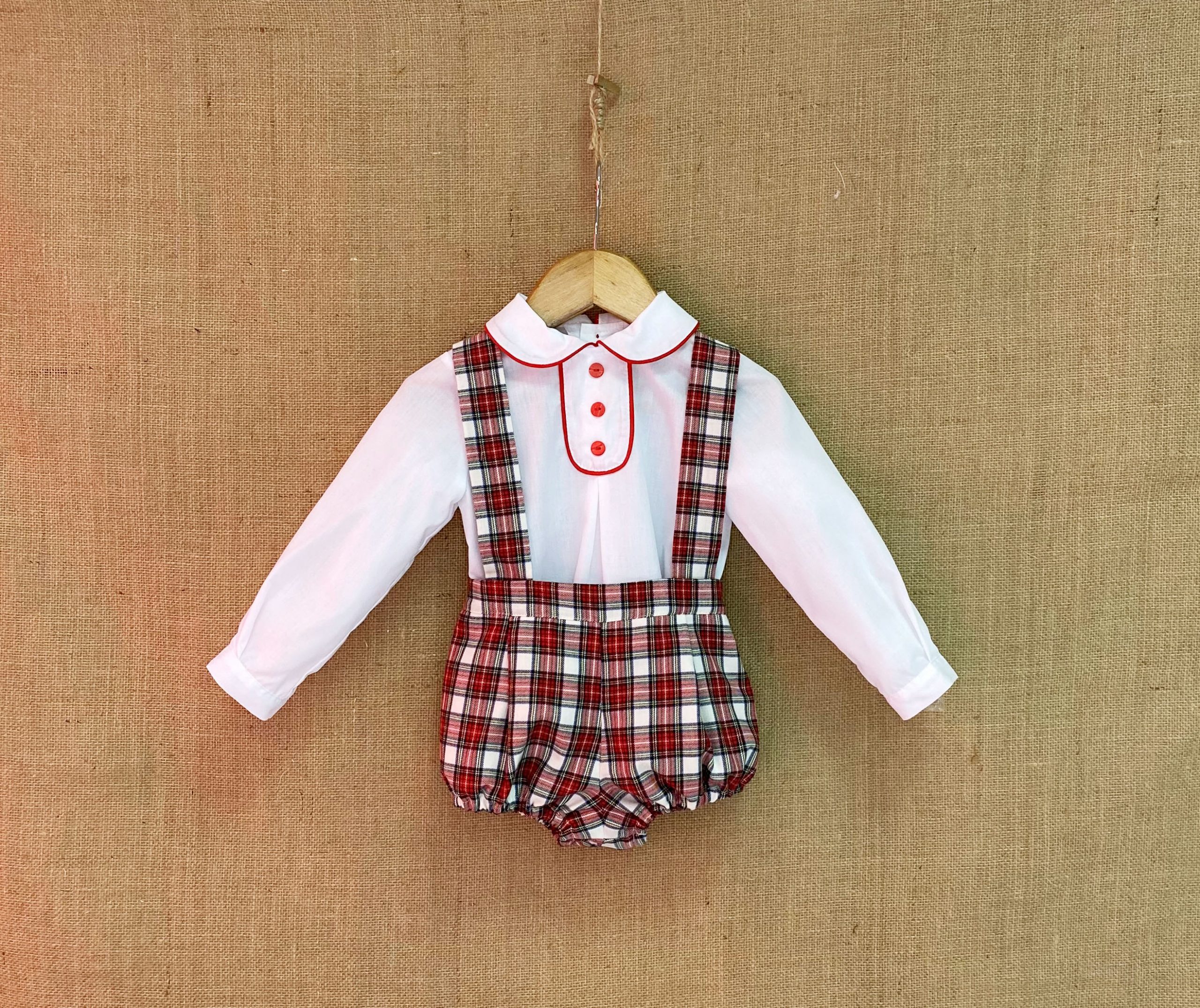 Conjunto de bebe con camisa blanca con detalle de botones rojos y peto de cuadros