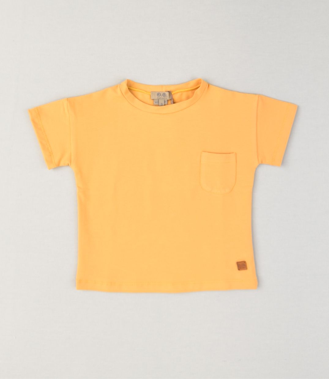Camiseta de manga corta, cuello redondo y bolsillo lateral. Color mostaza