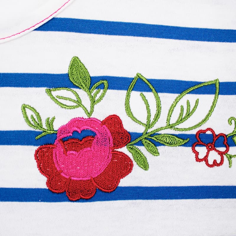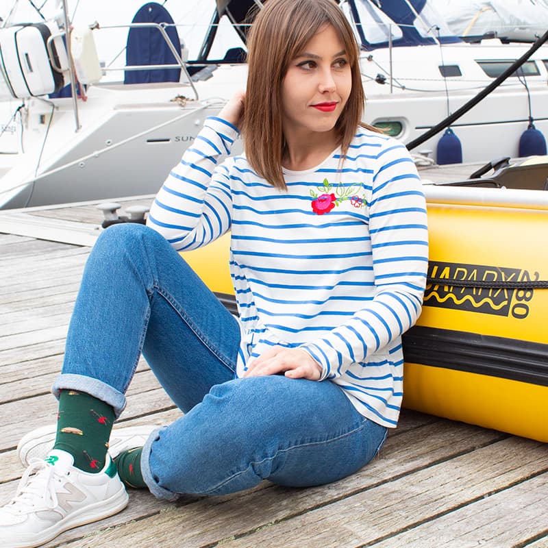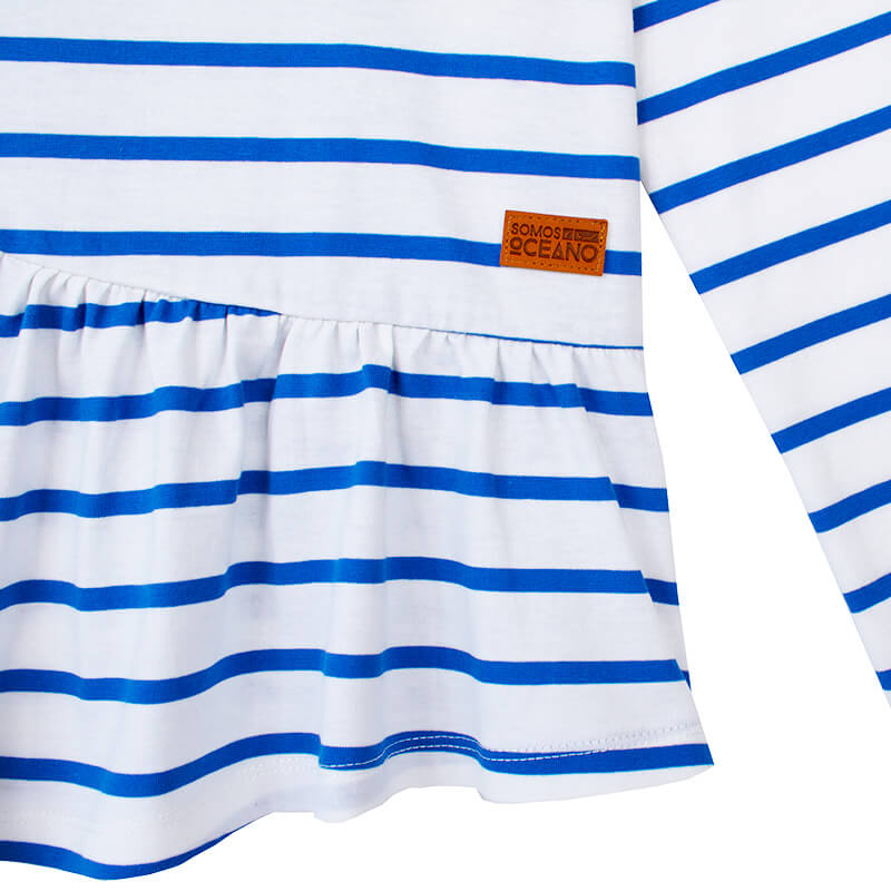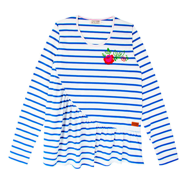 Camiseta 100% algodón de rayas marineras azules y blancas, manga larga, cuerpo suelto y bajo asimétrico con amplio volante. Delicado bordado multicolor en el pecho.