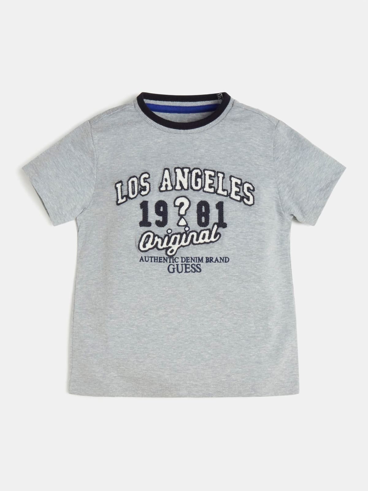 Camiseta de algodón de manga corta, cuello redondo, con letras en el frontal. Fondo de color gris y cuello azul