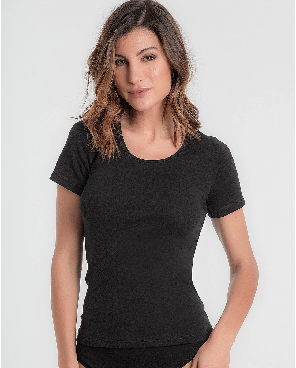 Camiseta de señora de manga corta de Playtex/Princesa. Elaborada con algodón elástico, sin costuras laterales y con cuello redondo y amplio.
