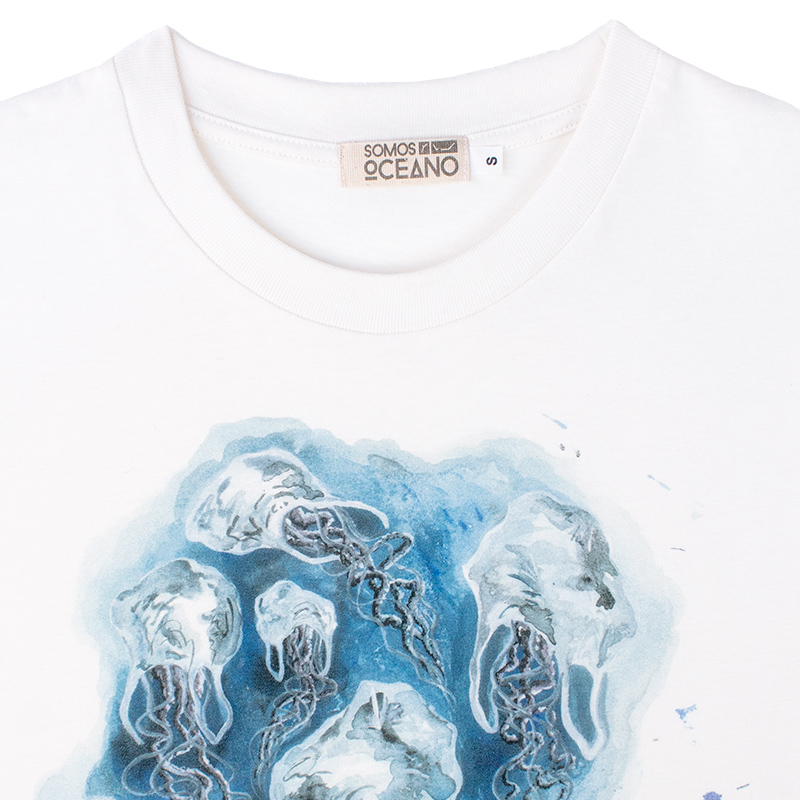 Suave camiseta de algodón orgánico en color crudo con estampado en tonos azules en donde unas medusas surcar los mares, ¿o son bolsas de plástico? Ilustración realizada por Vera Crisóstomo Rodríguez.