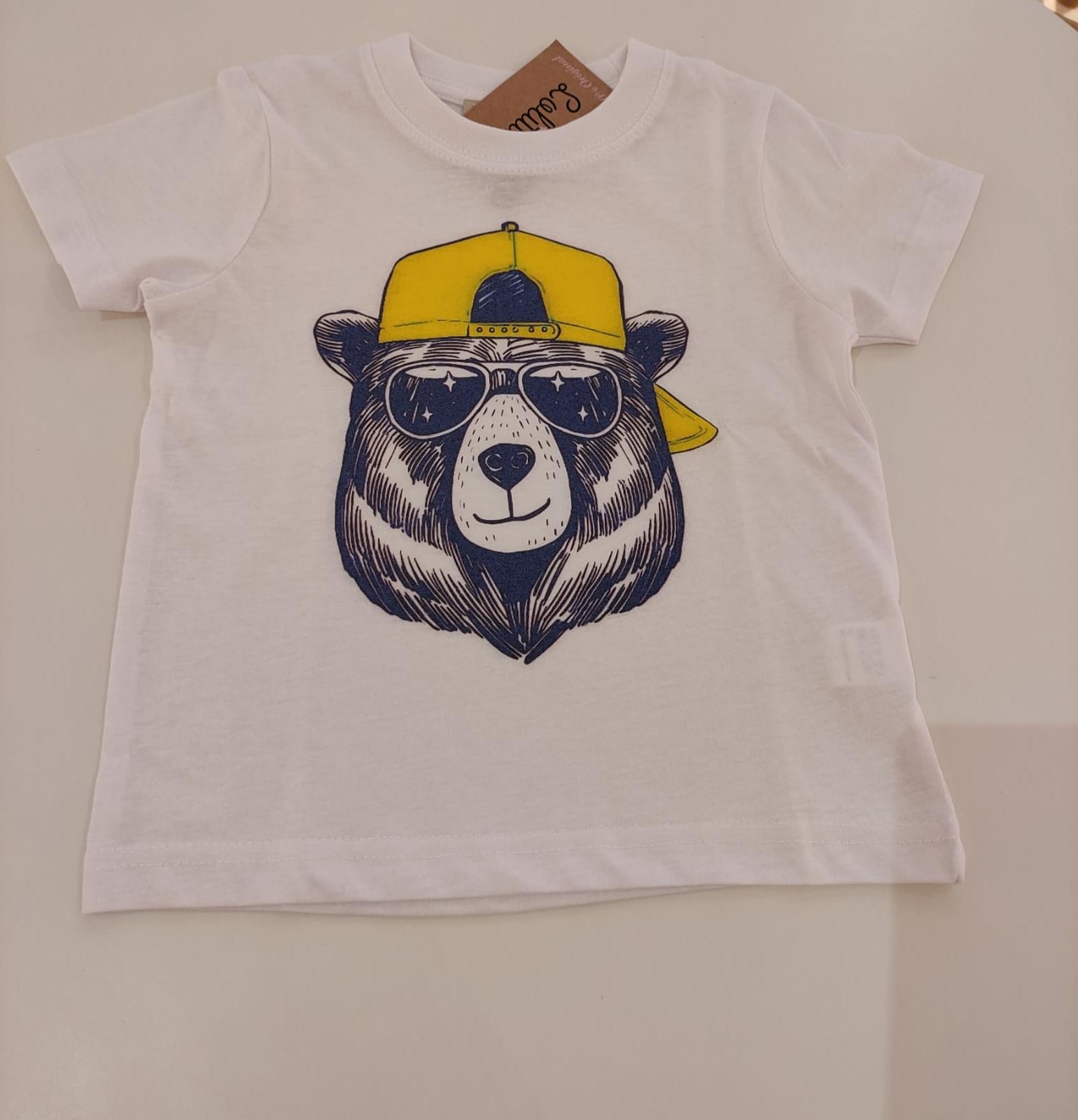 Camiseta de manga corta, color blanco con dibujo de un oso