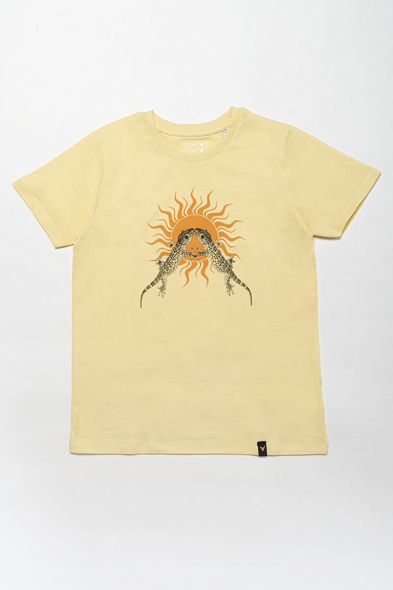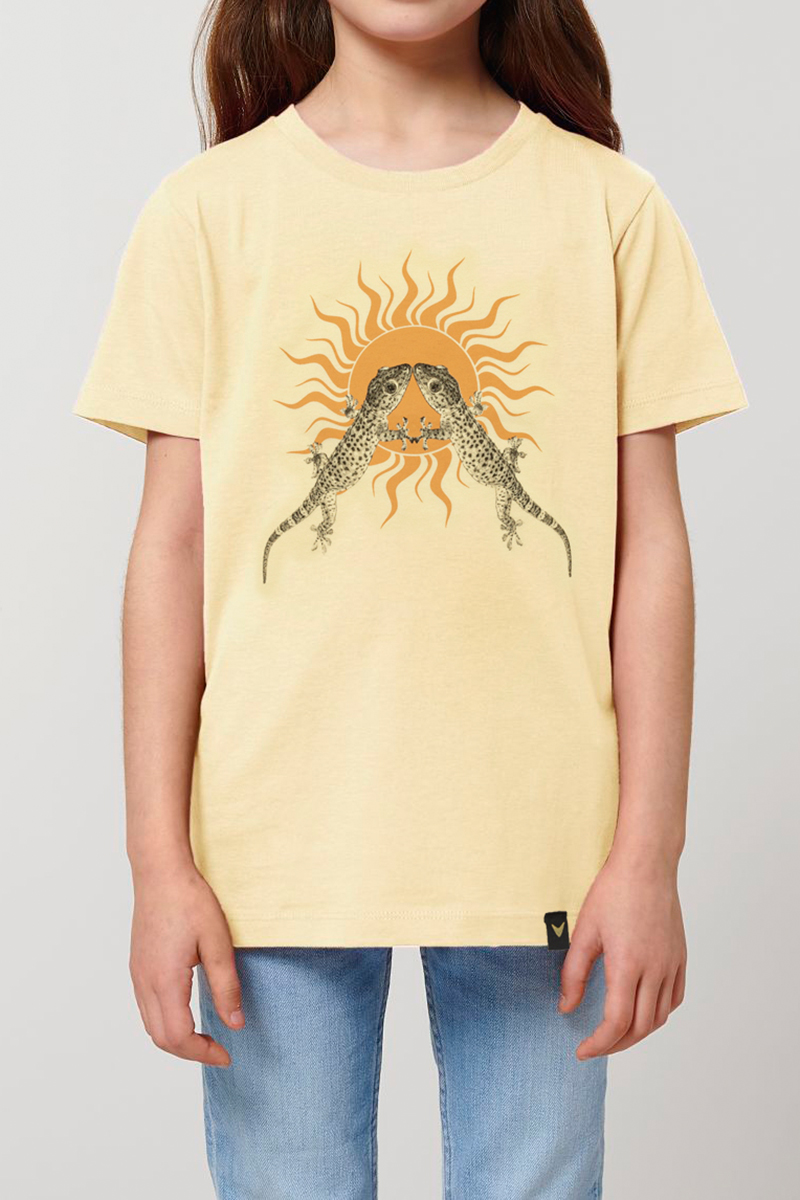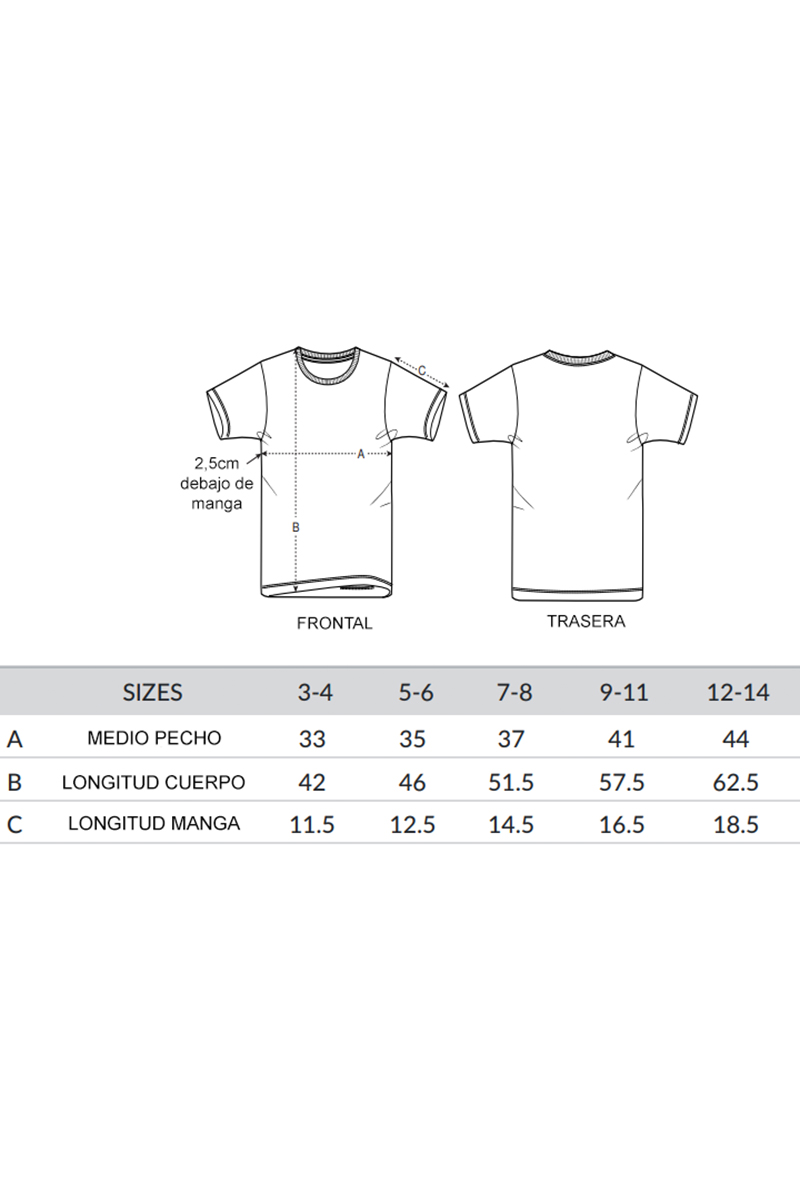 Camiseta niñ@ de manga corta 100% de algodón orgánico. Realizada de forma sostenible y vegana, con diversos certificados que acreditan su producción respetuosa con el medio ambiente y los trabajadores.