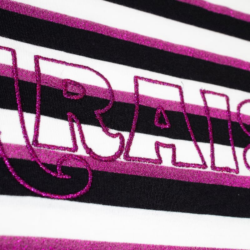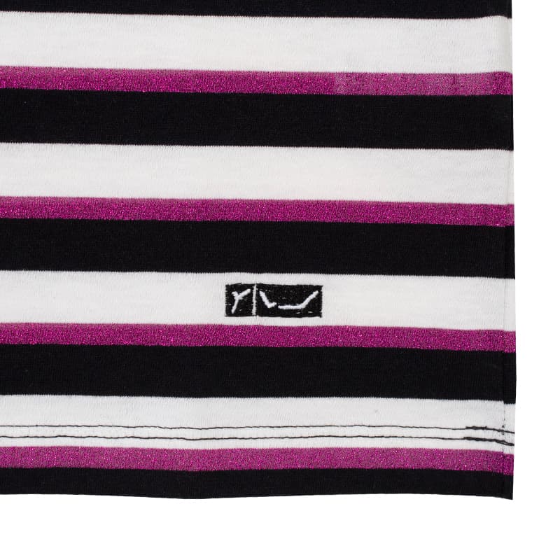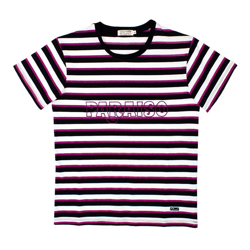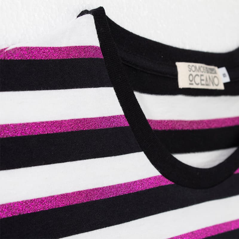 Camiseta con cuerpo recto, con rayas marineras en color negro, crudo y rosa buganvilla metalizado brillante. Bordado en el pecho en hilo metalizado y cuello redondo en color negro.