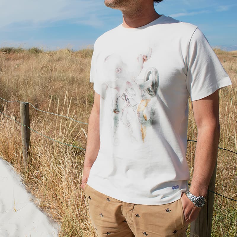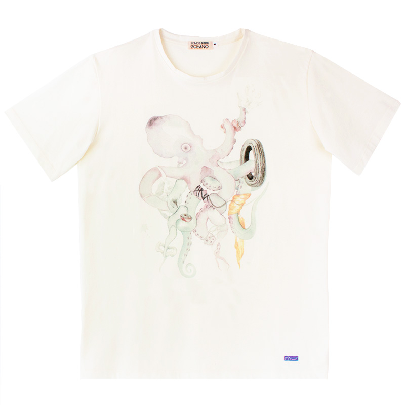 ¿Has visto lo atareado que está este pulpo limpiando su mar? Desgracidamente esto es lo que pasa a diario por eso esta suave camiseta de algodón orgánico reivindica los mares limpios. Ilustración de la joven artista Vera Crisóstomo Rodríguez.