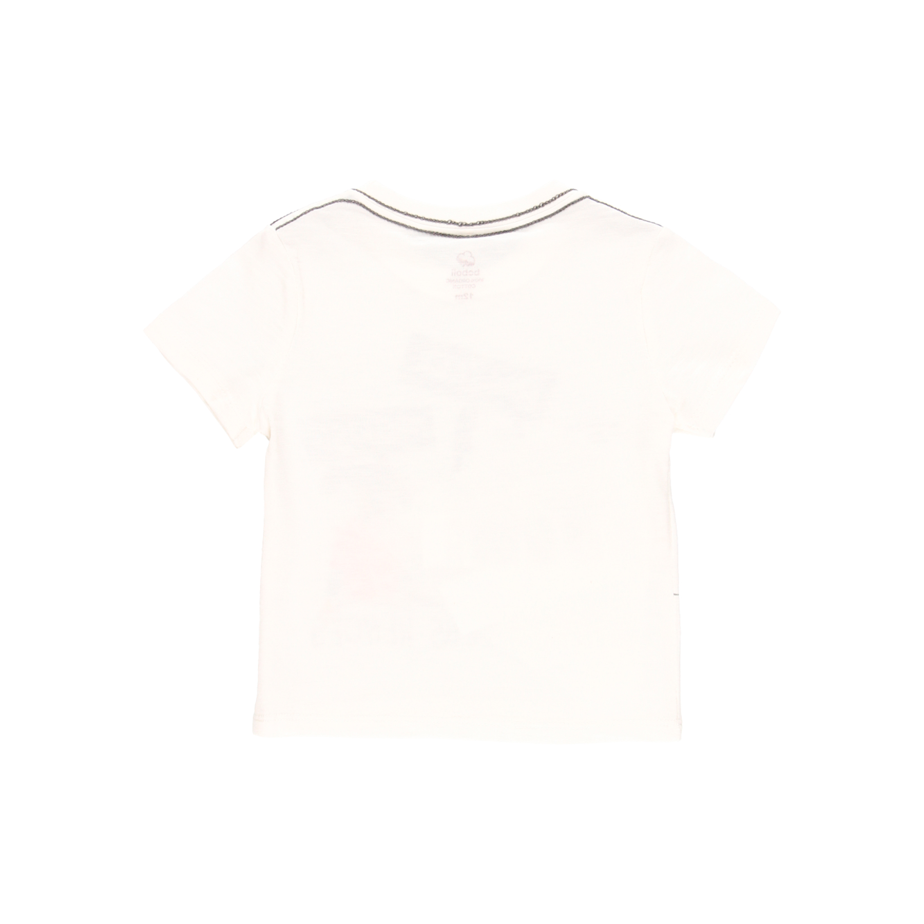 Camiseta de niño de punto liso flamé de algodón orgánico en color blanco roto. Tiene como decoración un estampado grande de varios animales con pancartas, en varios colores.