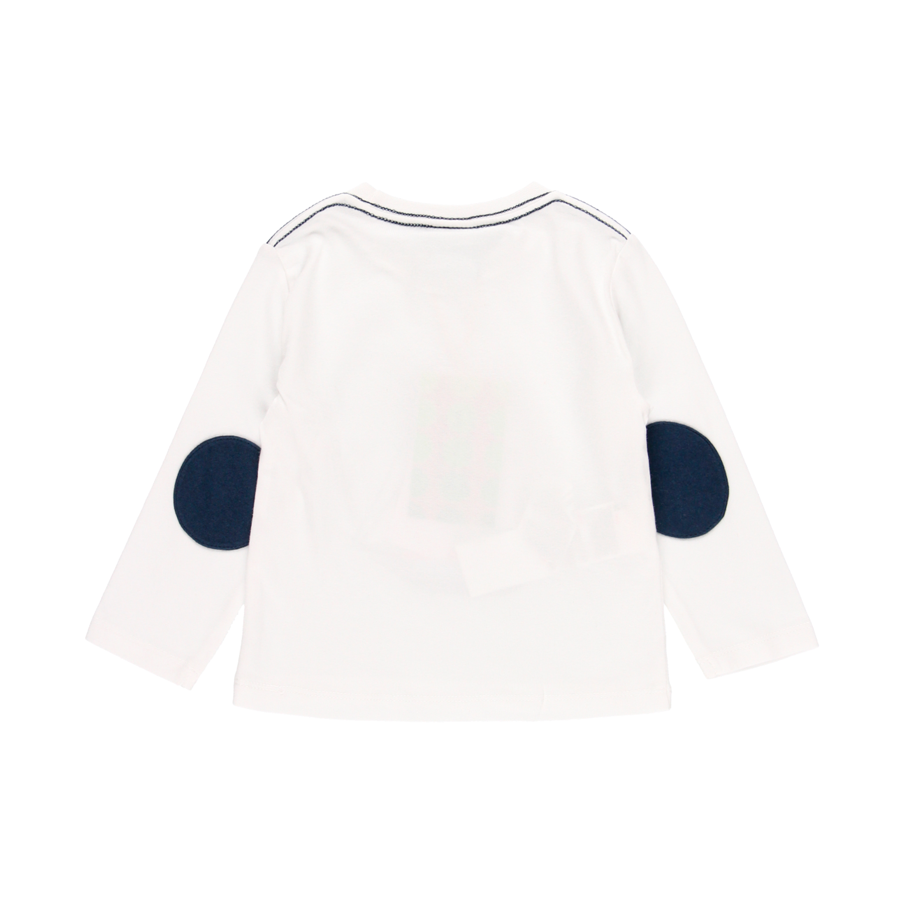 Camiseta de niño de manga larga en punto liso en color blanco. La decoración es un estampado de un barco en varios colores. Tiene como detalle unas coderas en color marino.