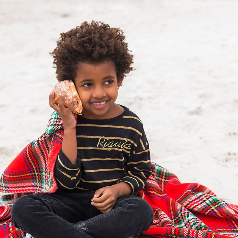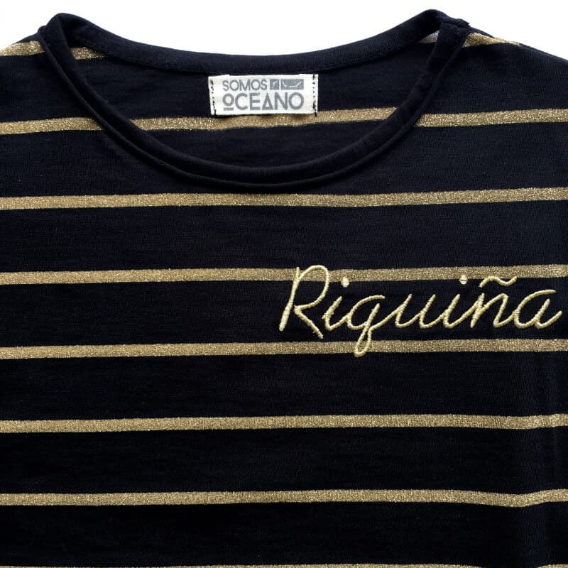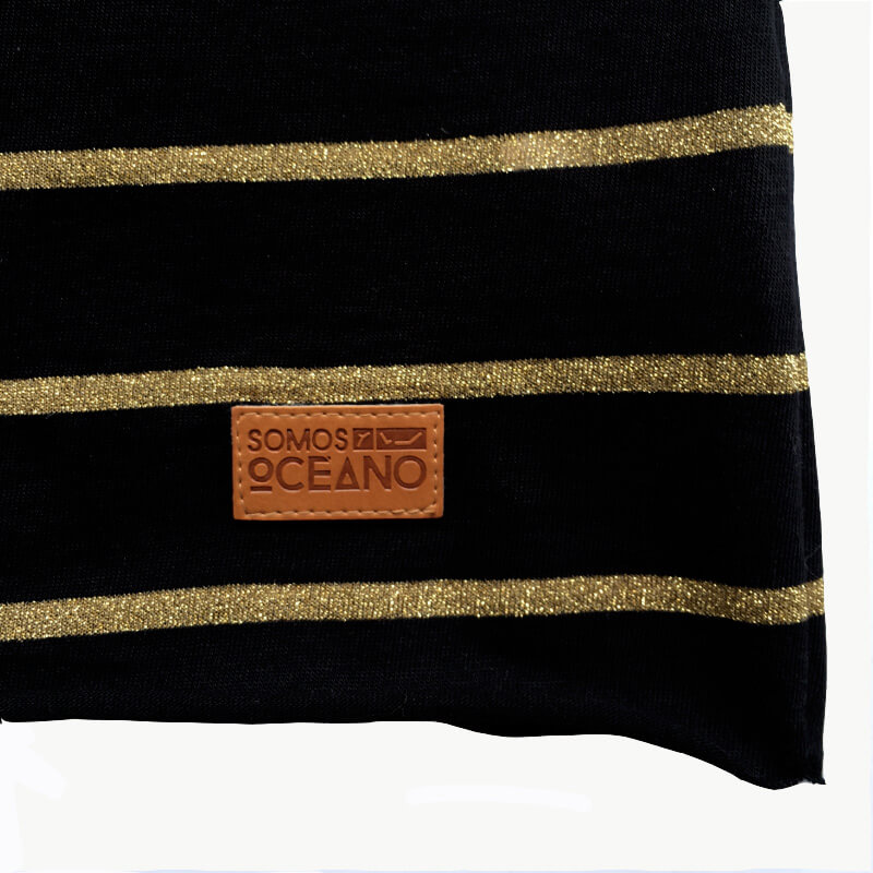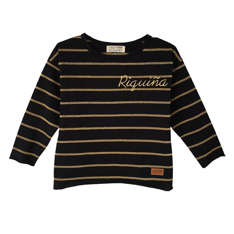 Camiseta de manga larga en color negro y rayas marineras en hilo dorado. Bordado en el pecho en hilo dorado.