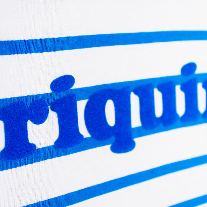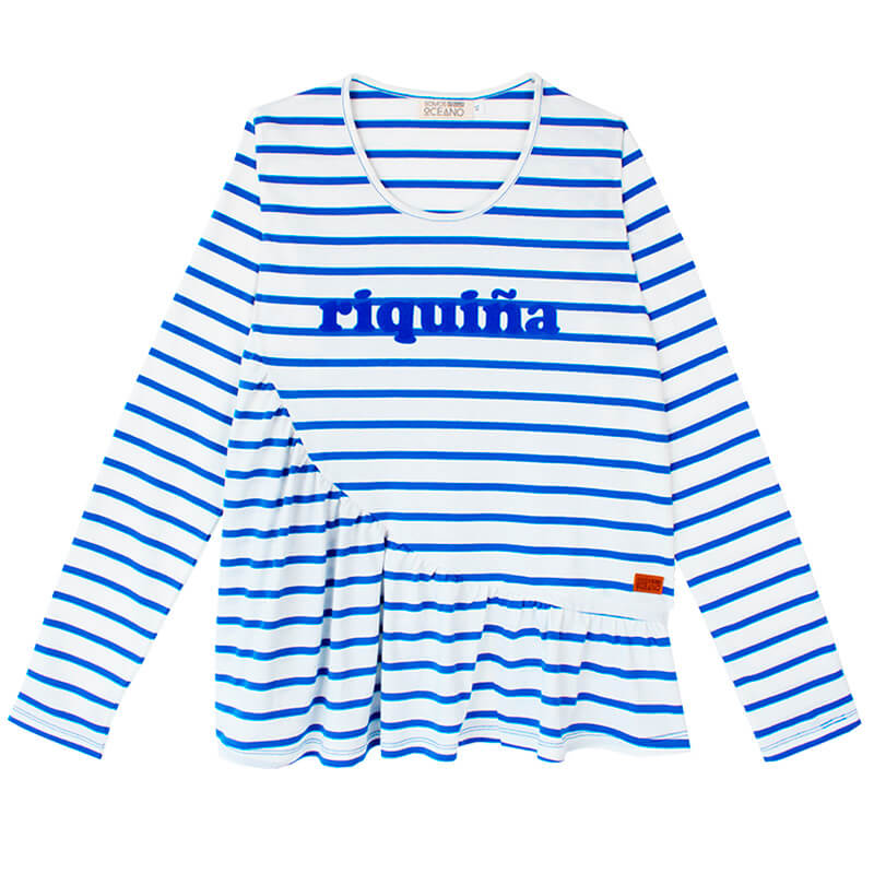 Camiseta 100% algodón de rayas marineras azules y blancas, manga larga, cuerpo suelto y bajo asimétrico con amplio volante. Estampado en el pecho con tacto de terciopelo.