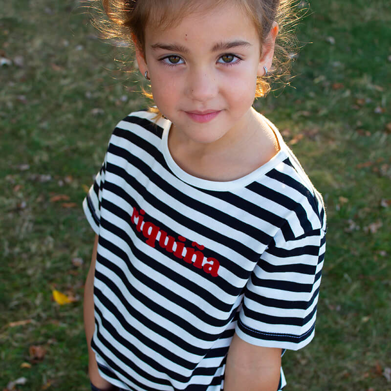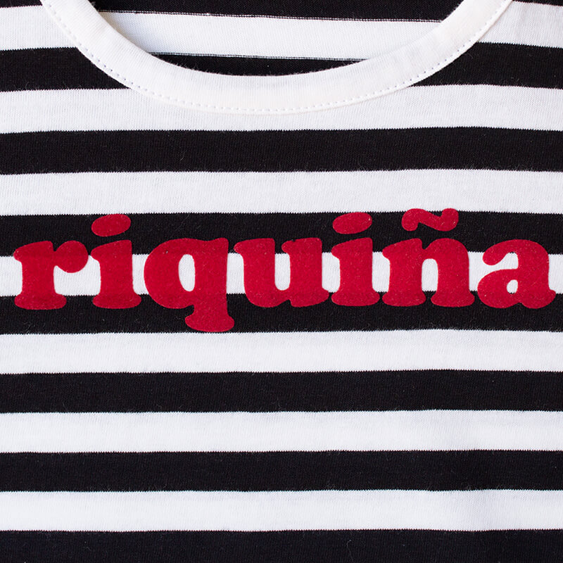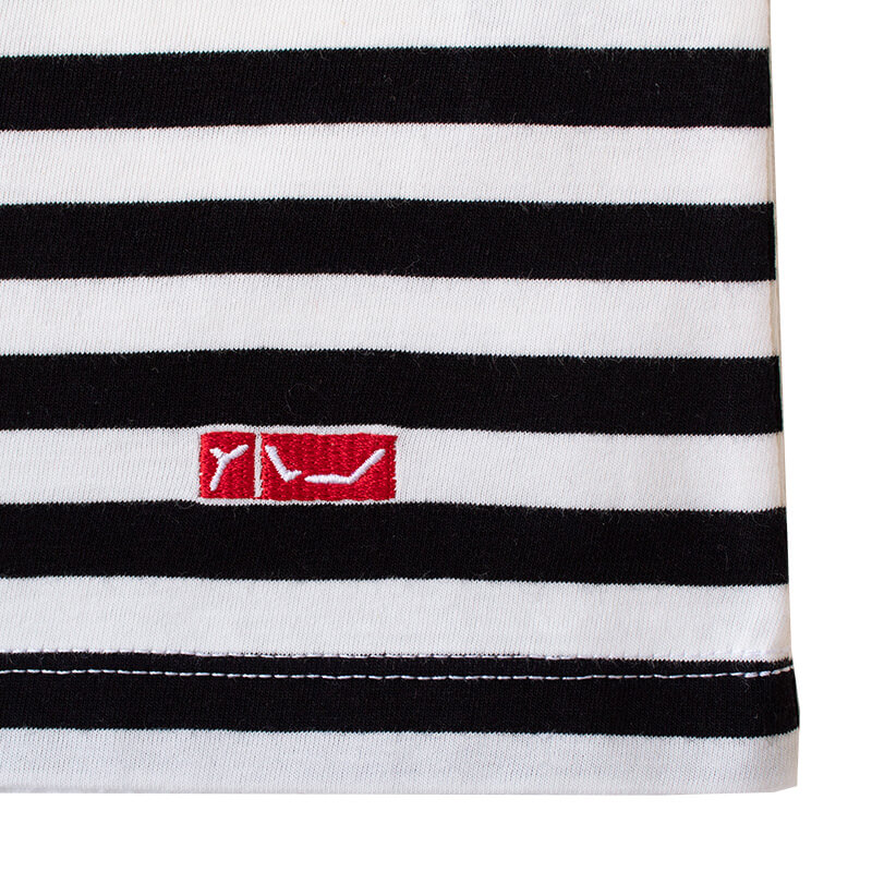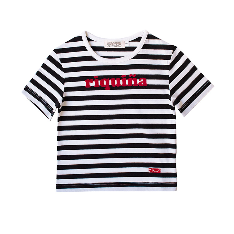 Camiseta manga corta de rayas marineras negras y crudas. Estampado en el pecho con tacto de terciopelo en color rojo. Detalle bordado en el bajo con logotipo.