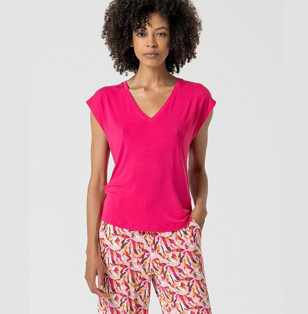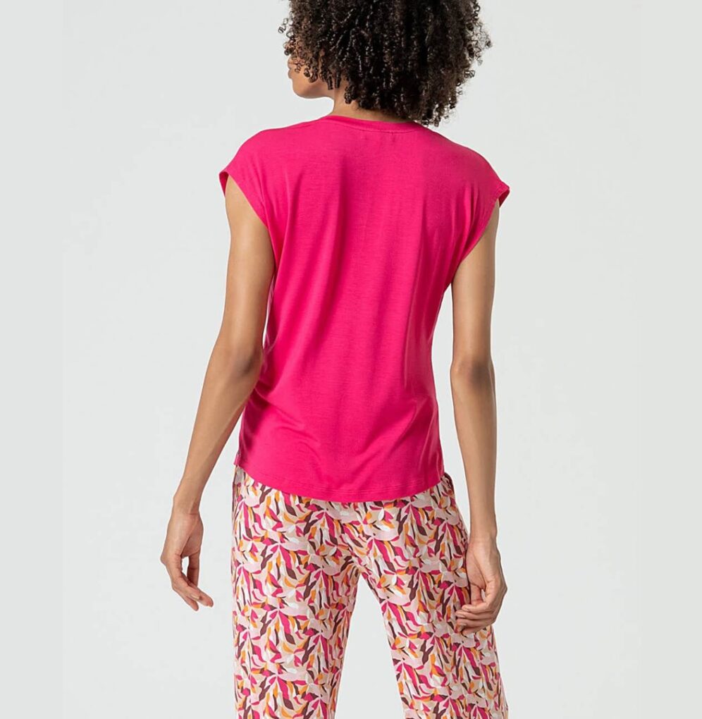 Camiseta fucsia sin mangas y escote pico o en V. De tejido suave y elástico, su composición es por 95% viscosa de bamboo y 5% elastano.